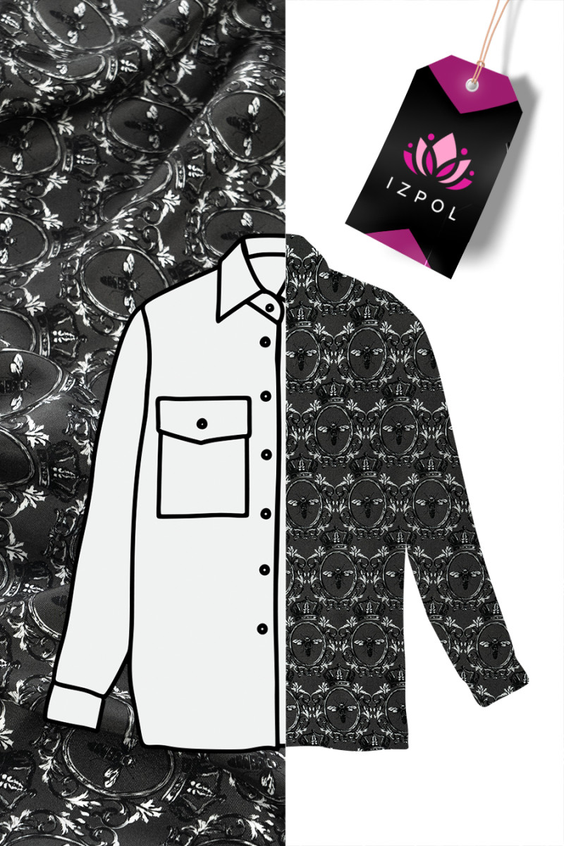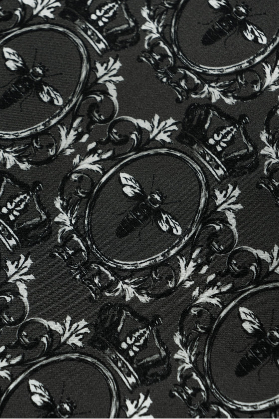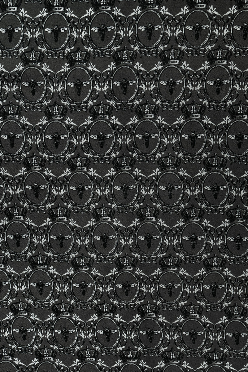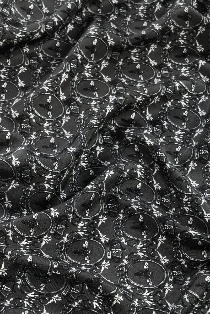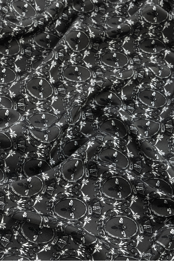 Italská 100% hedvábná keprová látka v šedé barvě s motivem mašličky, kepr v korunce v šedé a černé barvě (motiv je 8 cm). Hedvábný kepr je tkanina s keprovou vazbou, měkká, velmi odolná, jemně tuhá. Ideální pro šití košile, šatů, sukně nebo šály/šátku.