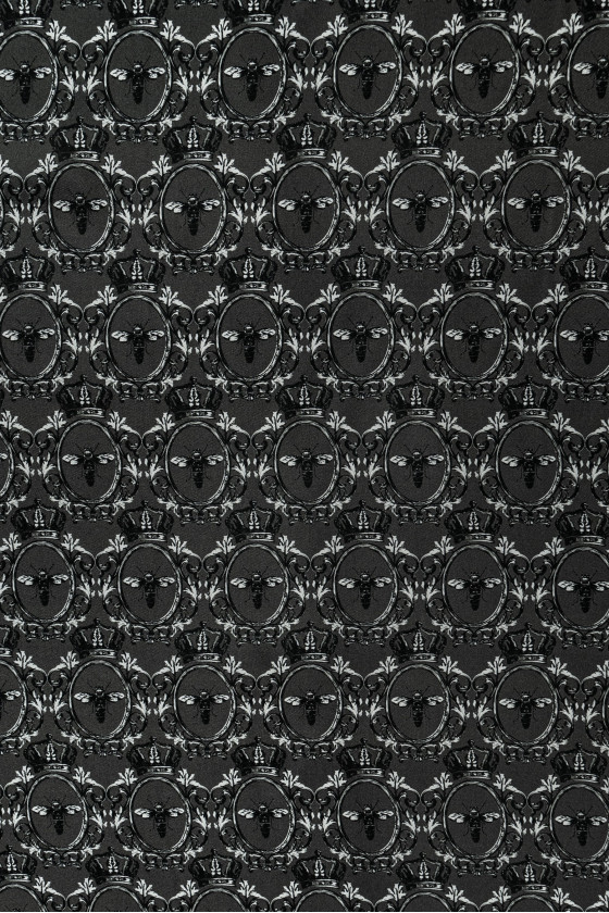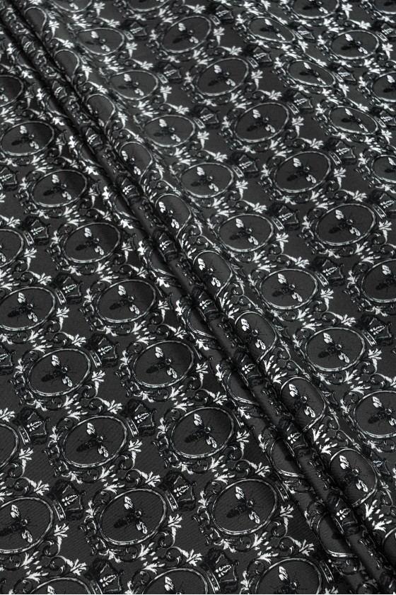 Italská 100% hedvábná keprová látka v šedé barvě s motivem mašličky, kepr v korunce v šedé a černé barvě (motiv je 8 cm). Hedvábný kepr je tkanina s keprovou vazbou, měkká, velmi odolná, jemně tuhá.