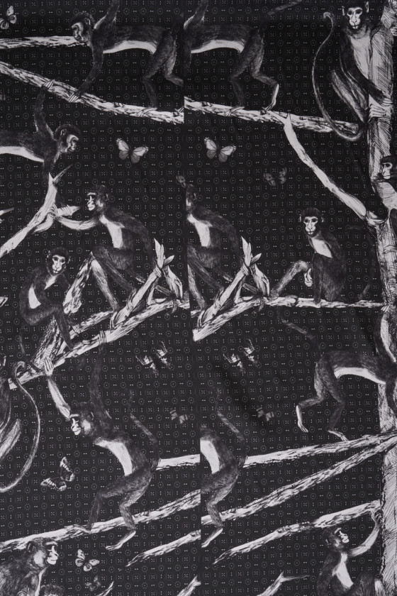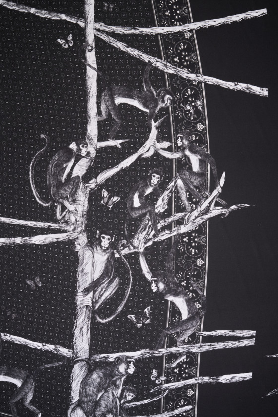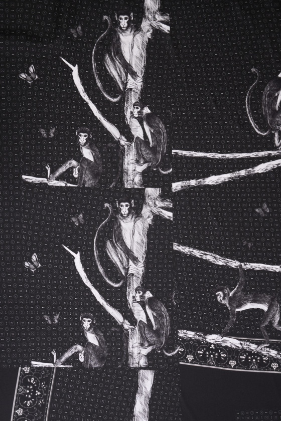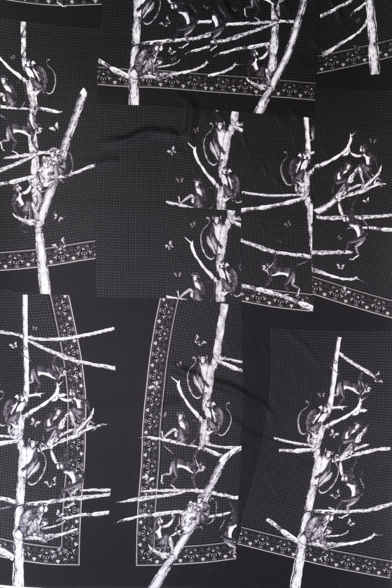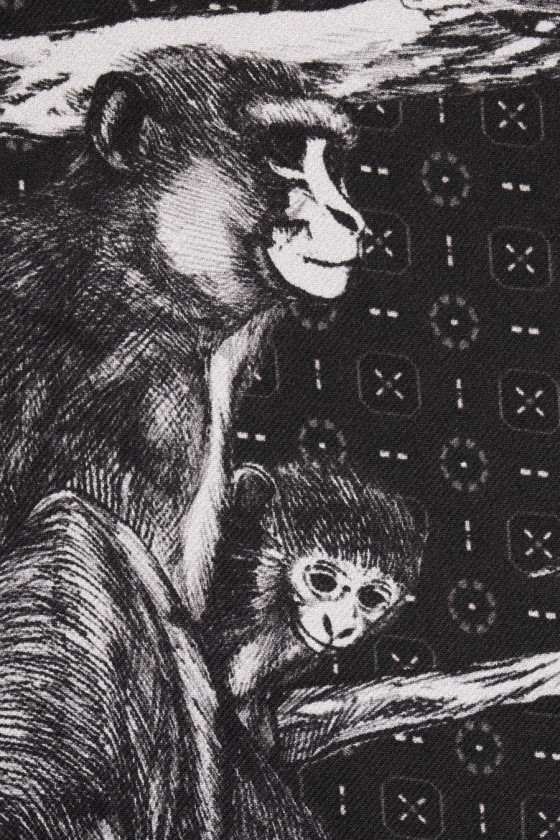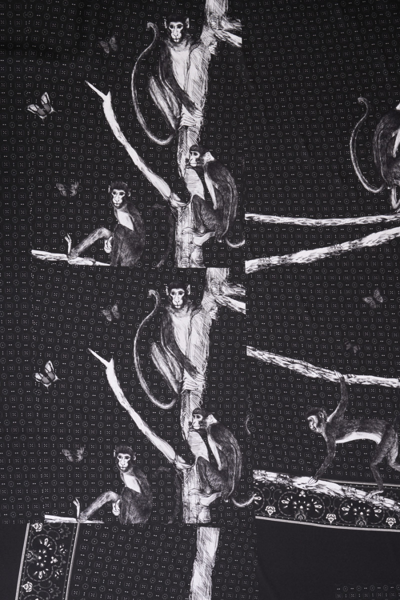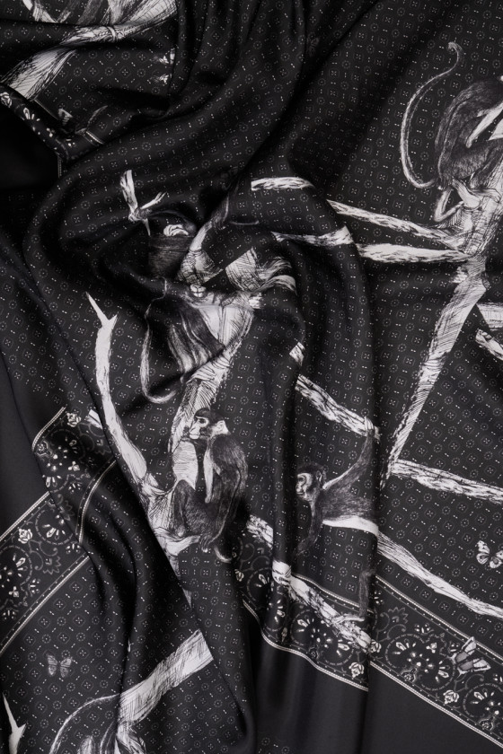 Italský 100% hedvábný kepr s motivem šedé opice na grafitovém podkladu vyplněný drobným vzorem. Látka je dodávána v kupónu o délce 230 cm a skládá se z hotových prvků ke střihu. Materiál je tenký, ale neprůhledný s jemnou keprovou vazbou, neelastický a pochází z kolekce známého módního domu. Fantastická nabídka pro fanoušky zvířecích vzorů, kteří hledají originalitu a výjimečnost.