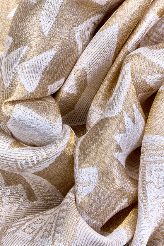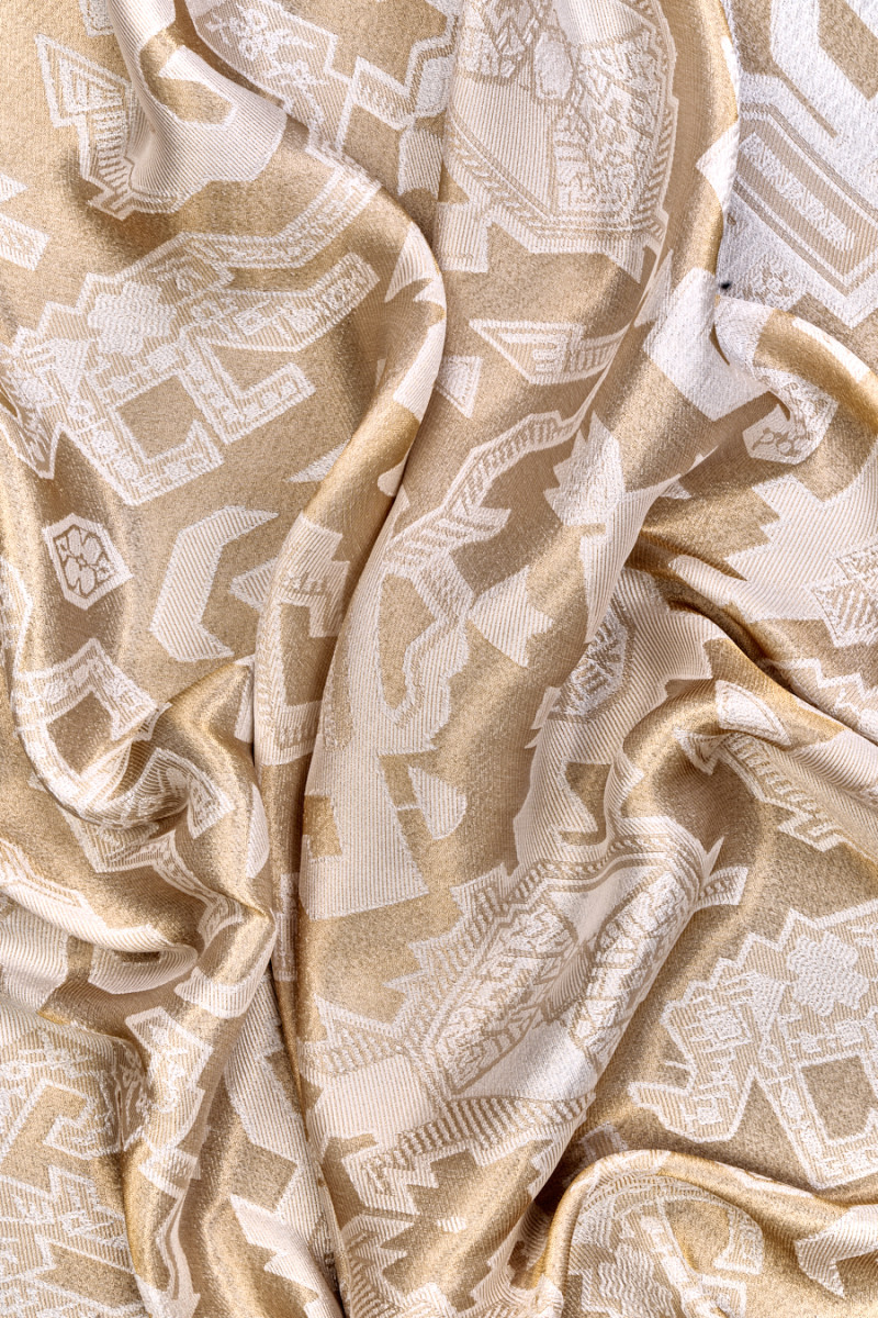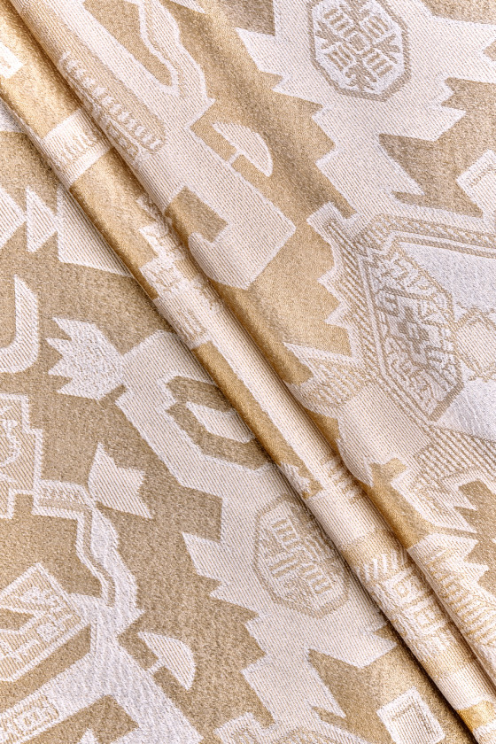 Italská žakárová látka s hedvábím s krémovými aztéckými vzory na zlatém pozadí. Vzor je poměrně hustý, velký a krásně se třpytí. Látka je tenká, neelastická, mírně průhledná, velmi lehká a vzdušná. Jedinečná nabídka, ze které můžete vykouzlit šaty, sukni, tuniku, ale i šál nebo šátek.