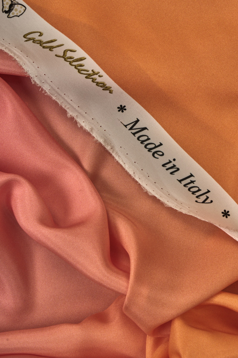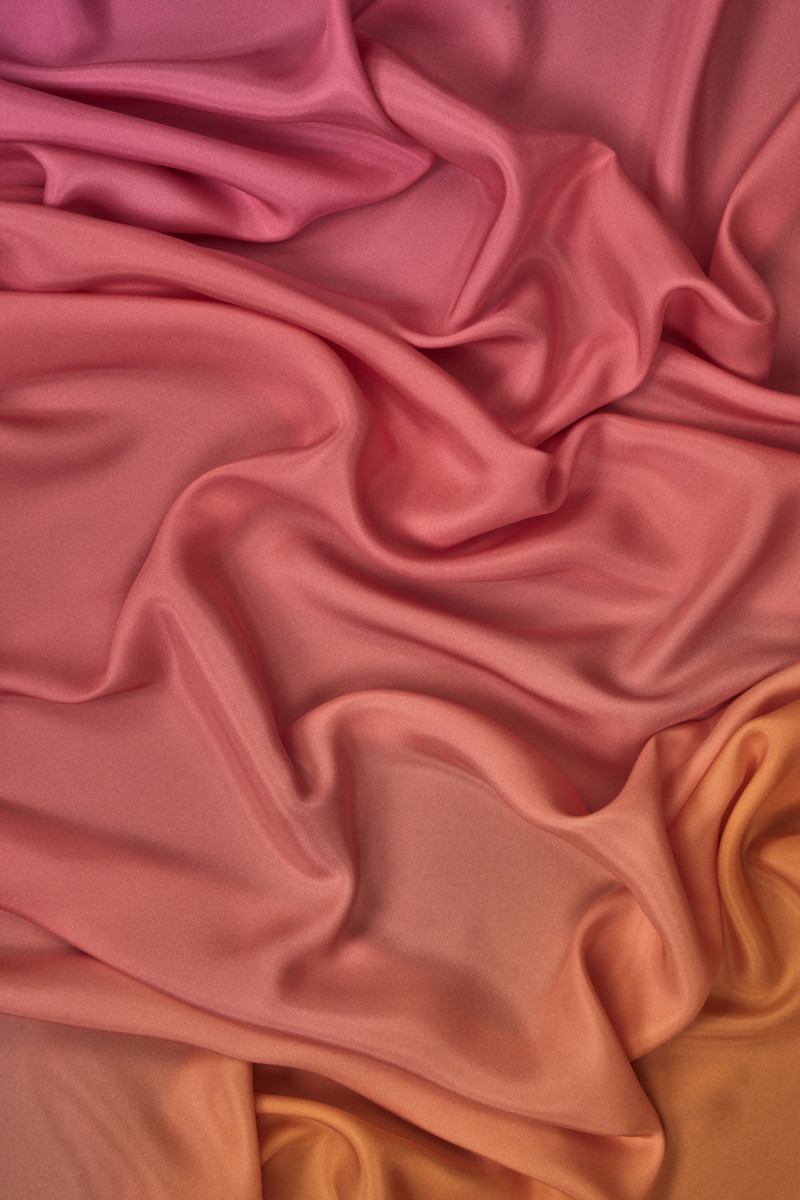 Italský 100% hedvábný satén s ombre efektem v růžové a oranžové barvě. Vzor vytištěný na matné straně přechází od oranžové na jednom okraji látky až po růžovou na druhém okraji - doporučujeme šít po obvodu. Látka je splývavá, měkká, velmi příjemná na dotek a neelastická. Krásná nabídka v energických barvách pro šaty, sukně a košile.