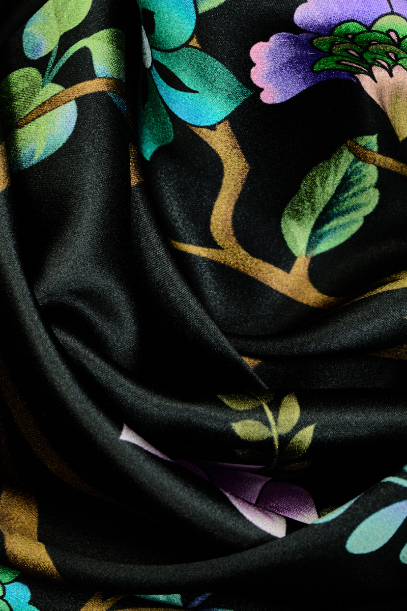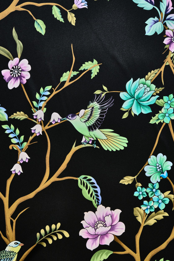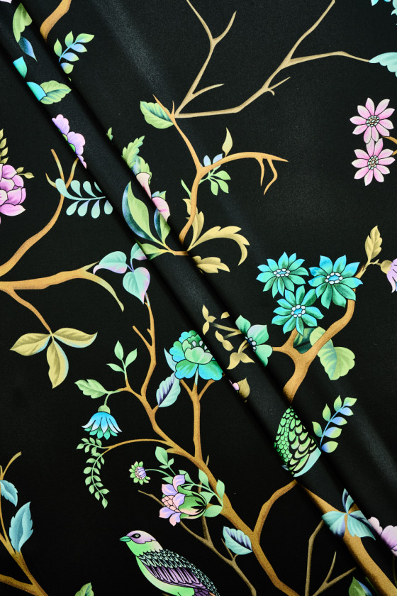 Italský hedvábný satén s přídavkem elastanu s poměrně hustým motivem hnědých větví zdobených barevnými květy a ptáčky na černém podkladu. Květiny a ptáci v energických odstínech tyrkysové, zelené a fialové. Látka je splývavá, měkká, elastická a krásně lesklá, což jí dodává jedinečnou eleganci. Skvěle se hodí k vzdušným šatům, sukním, ale i halenkám a košilím.