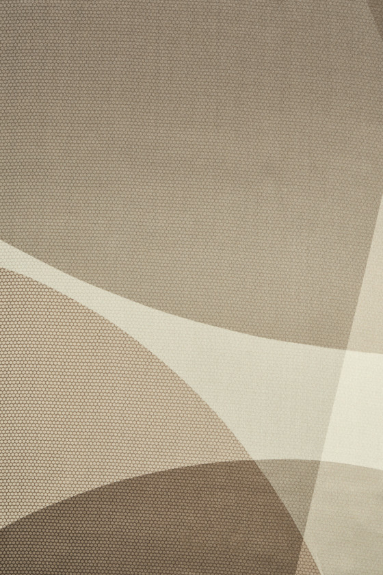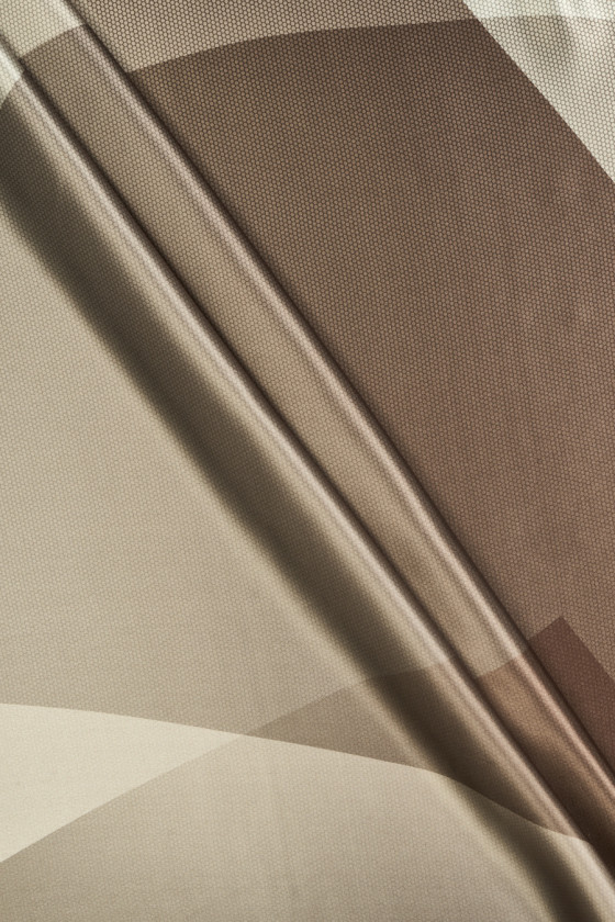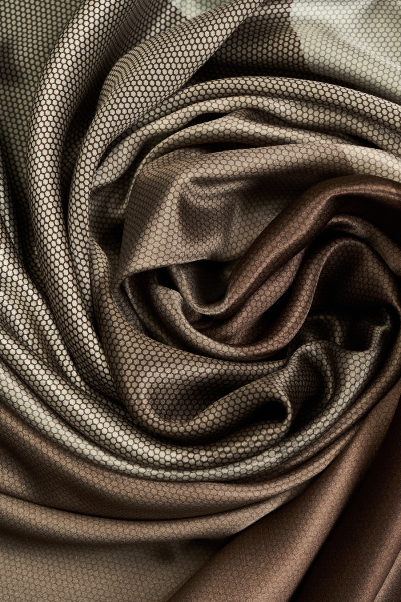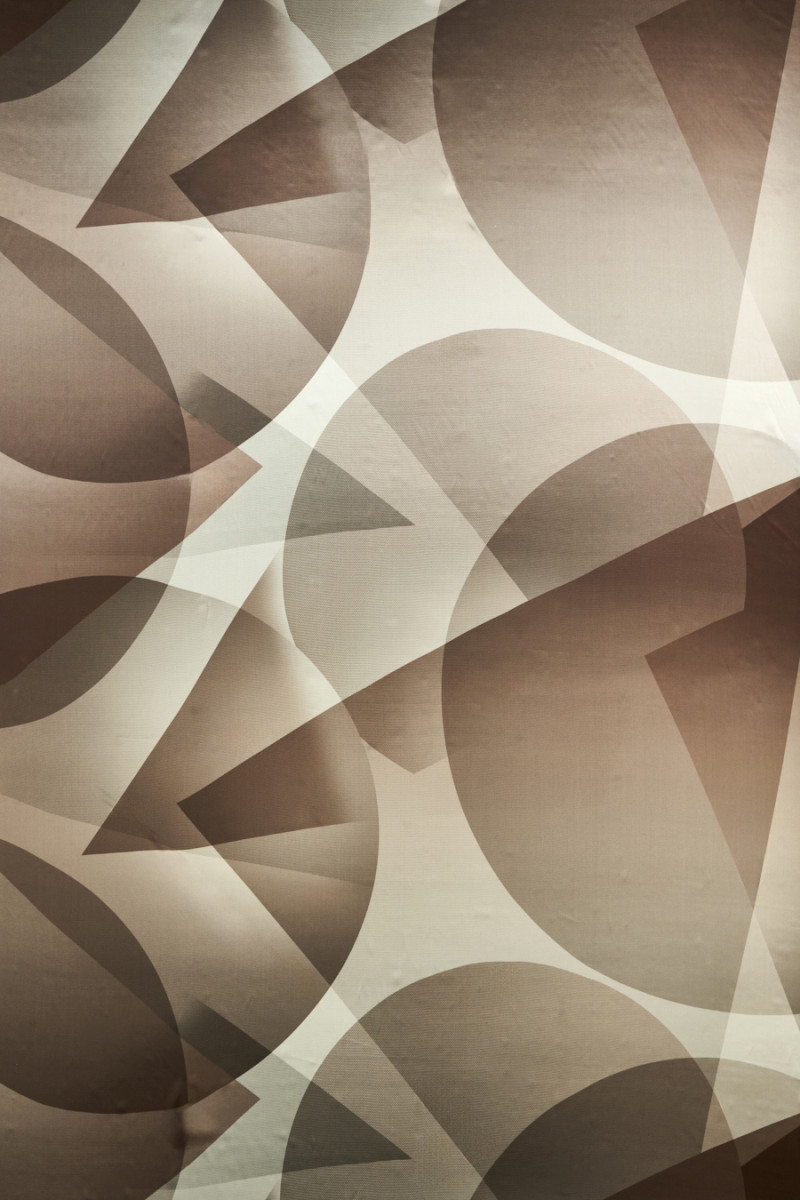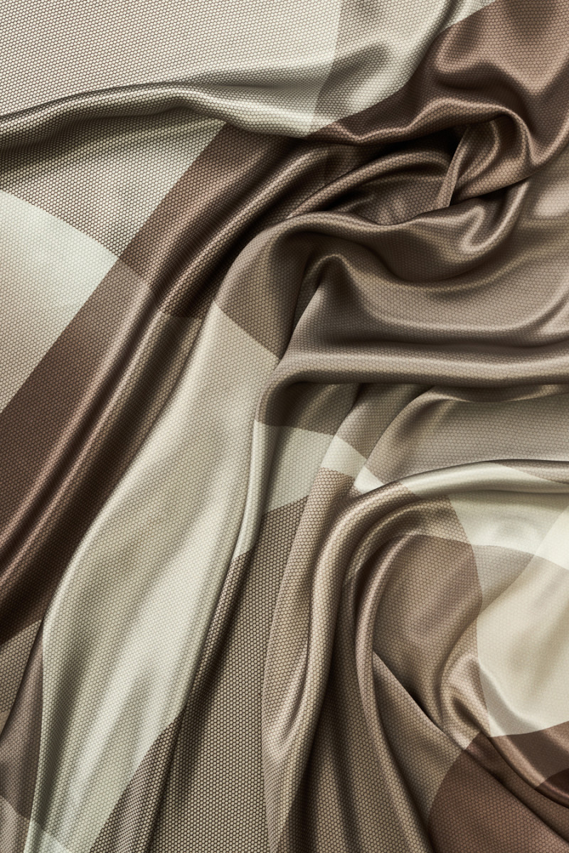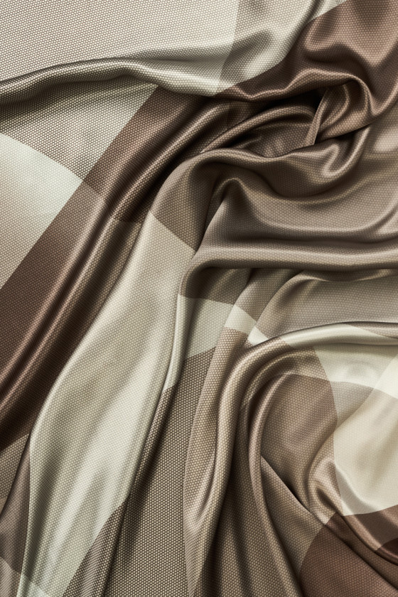 Italský 100% hedvábný satén s geometrickým motivem v odstínech hnědé, béžové a šedé. Na celek je vytištěn velký vzor zobrazující kruhy a trojúhelníky, které se překrývají, vzor velmi jemné síťoviny, což dodává materiálu zajímavý vzhled. Látka je neprůhledná, splývavá, měkká, neelastická a lesklá. Doporučujeme k šatům, sukním, halenkám a košilím.