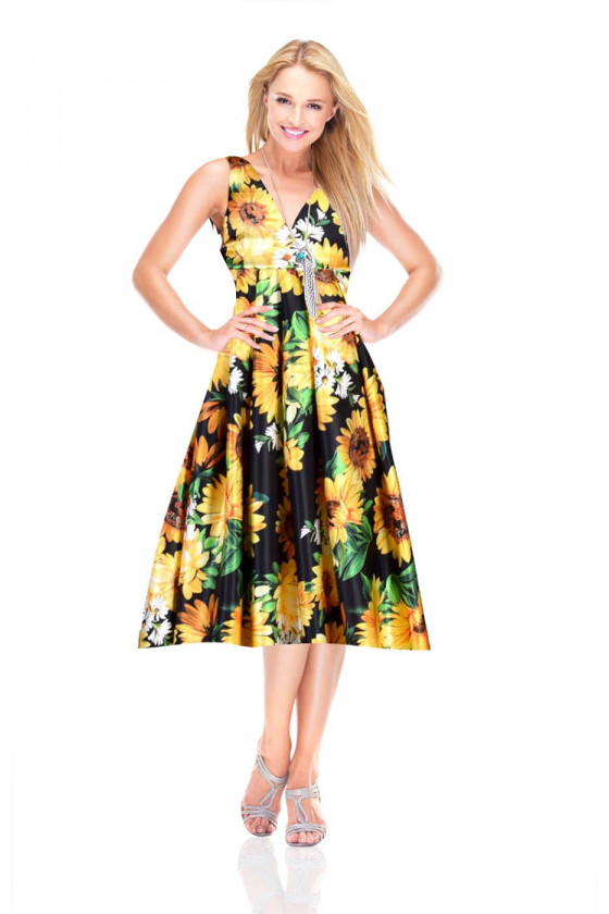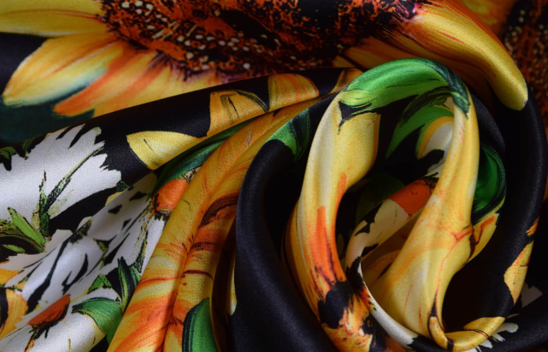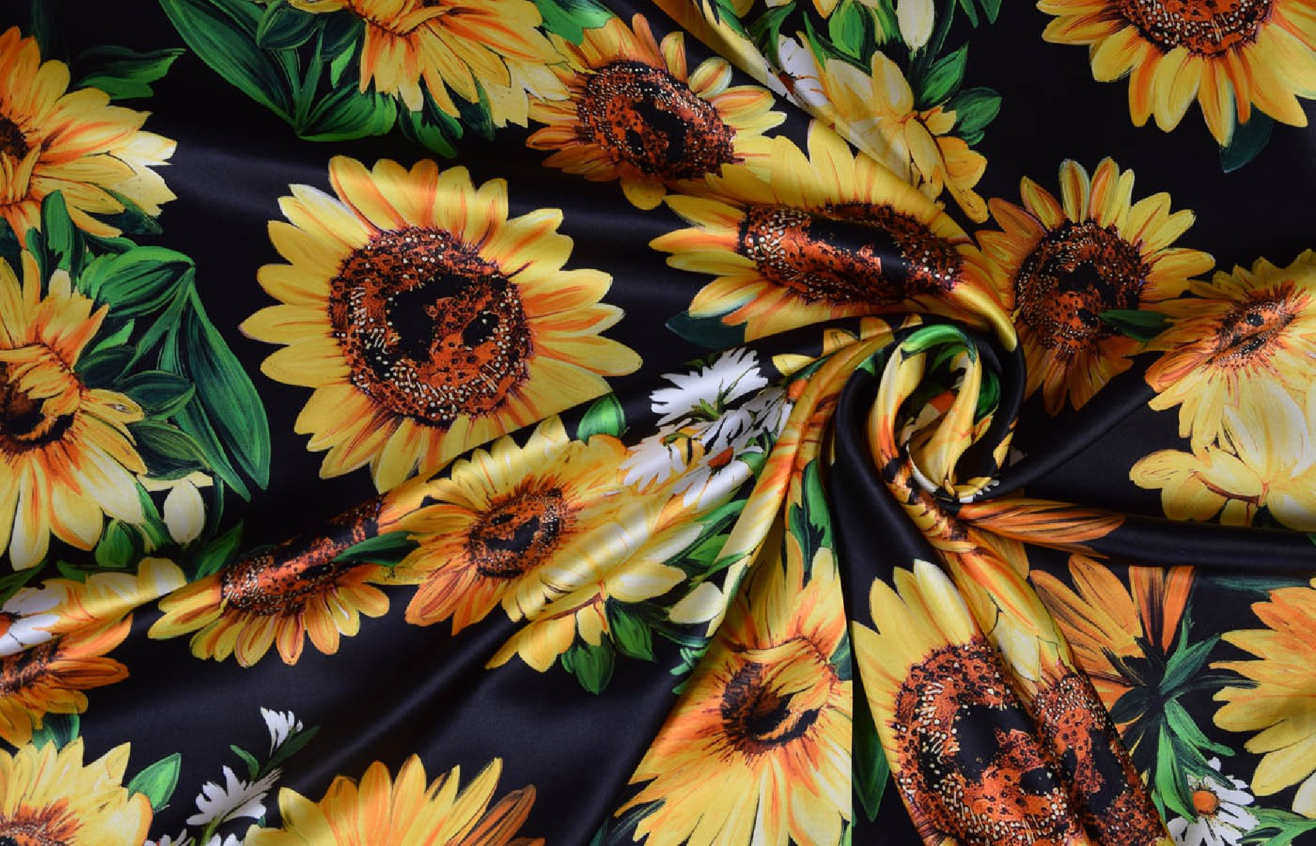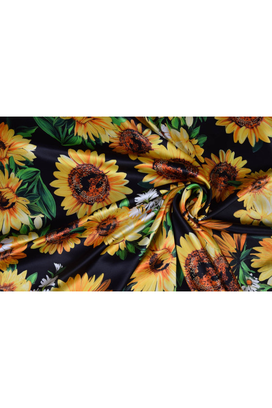 Hedvábný satén je jemná látka, sametová na dotek, s jemným leskem. Lze s ním vykouzlit vzdušné šaty, jemné halenky, šátky, šátky. Slunečnicový vzor.