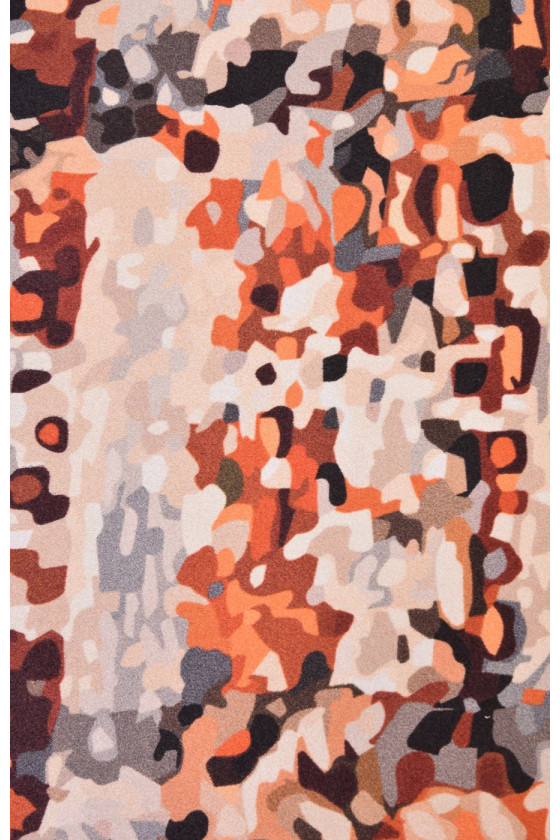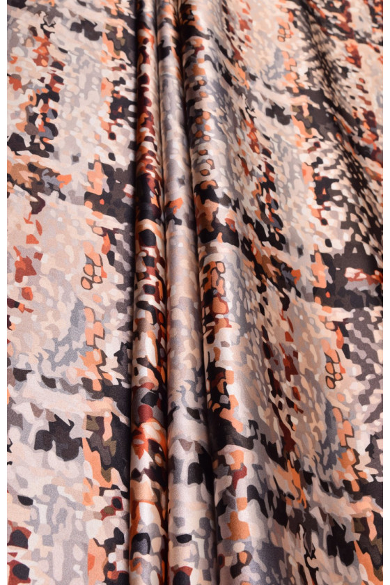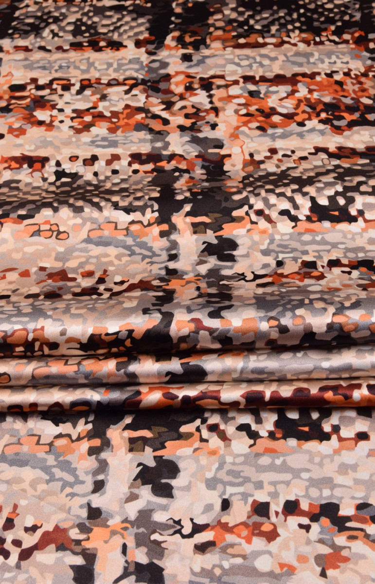 Hedvábný satén s velkým károvaným potiskem je jemná látka, sametová na dotek, s jemným leskem. Lze s ním vykouzlit vzdušné šaty, jemné halenky, šátky, šátky.