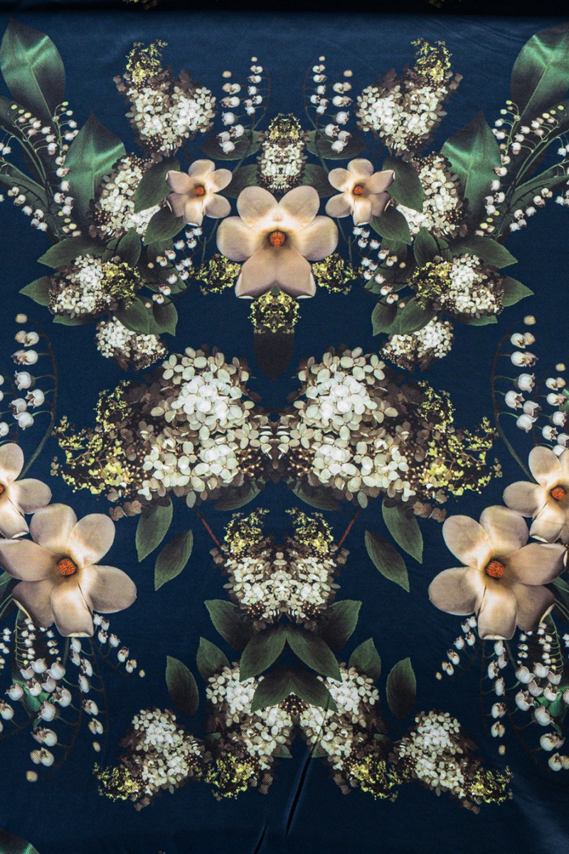 Krásné vzorované hedvábí s keprovou vazbou s květinovým motivem. visačky. Látka je lehká, vzdušná, neprůhledná. Ideální k šatům, tunikám, halenkám. Látka je dodávána v kupónu o rozměrech 125 cm* 140 cm.