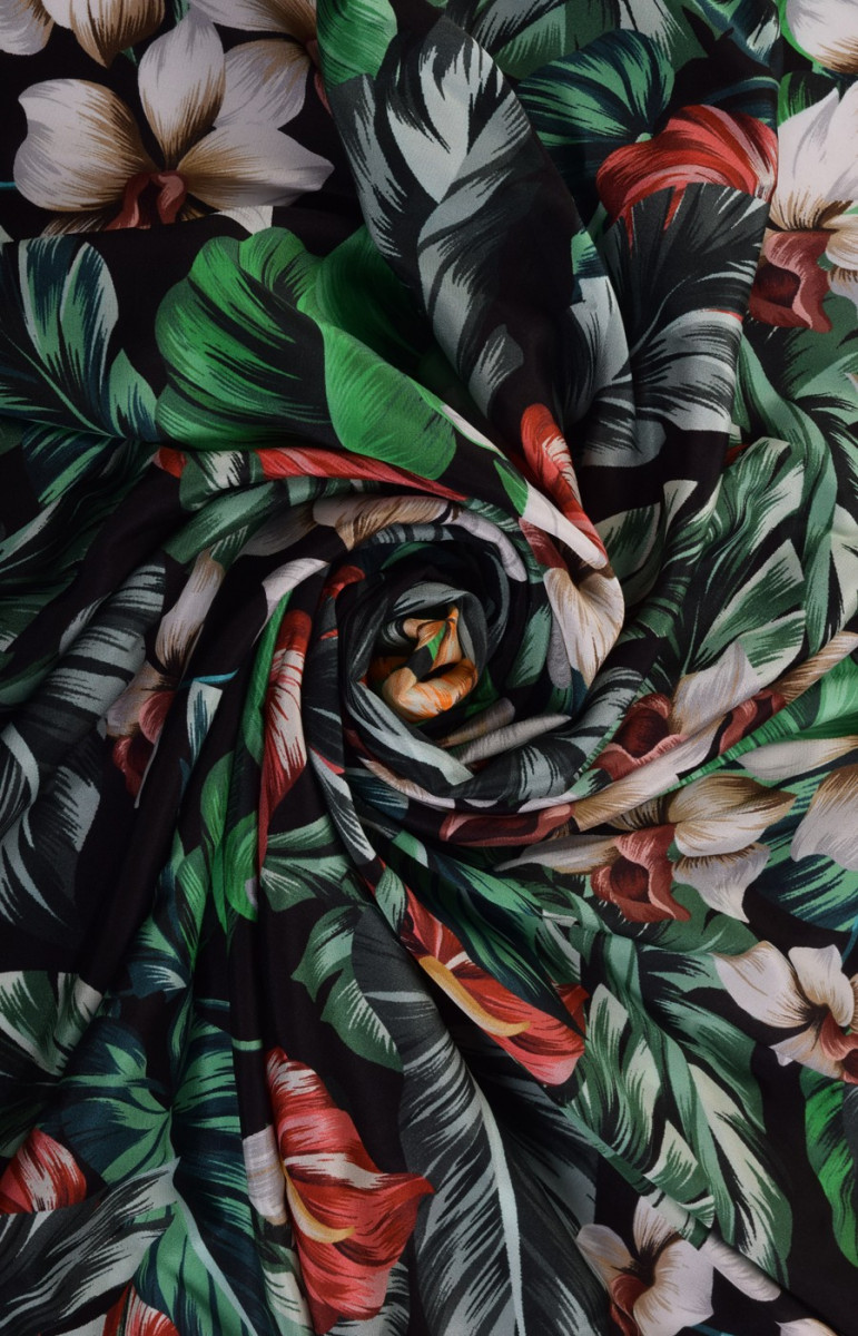 Hedvábný krep s elastanem je jemná látka, sametová na dotek, poloprůhledná. Potisk džungle, můžete vykouzlit vzdušné šaty, jemné halenky, pareo. Doporučujeme použít podšívku.