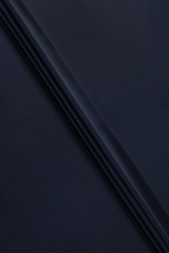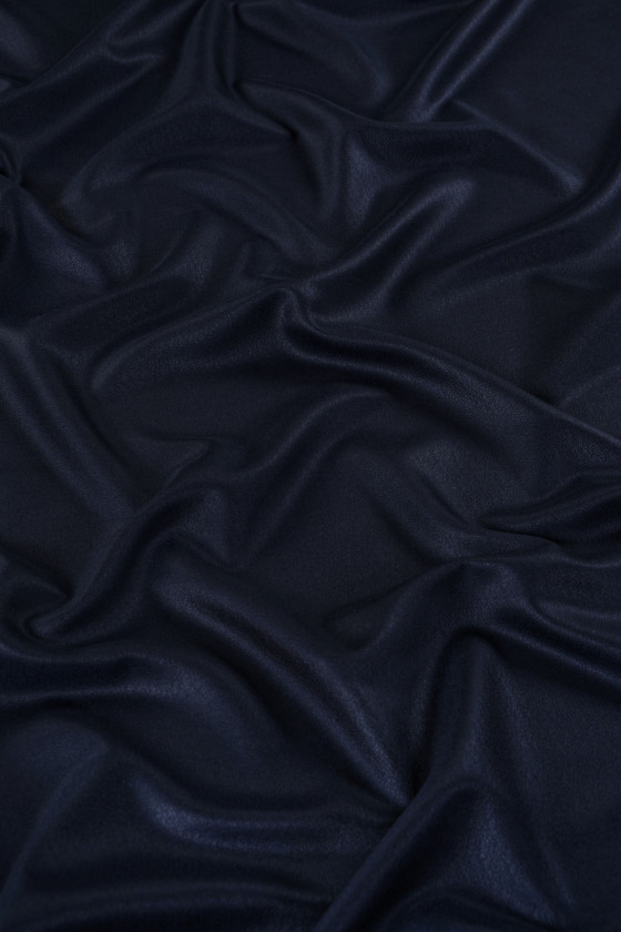 Italská kostýmová vlna v tmavě modré barvě se zajímavou, jemnou žakárovou vazbou. Měkká, tenčí, neelastická tkanina s krásným leskem.