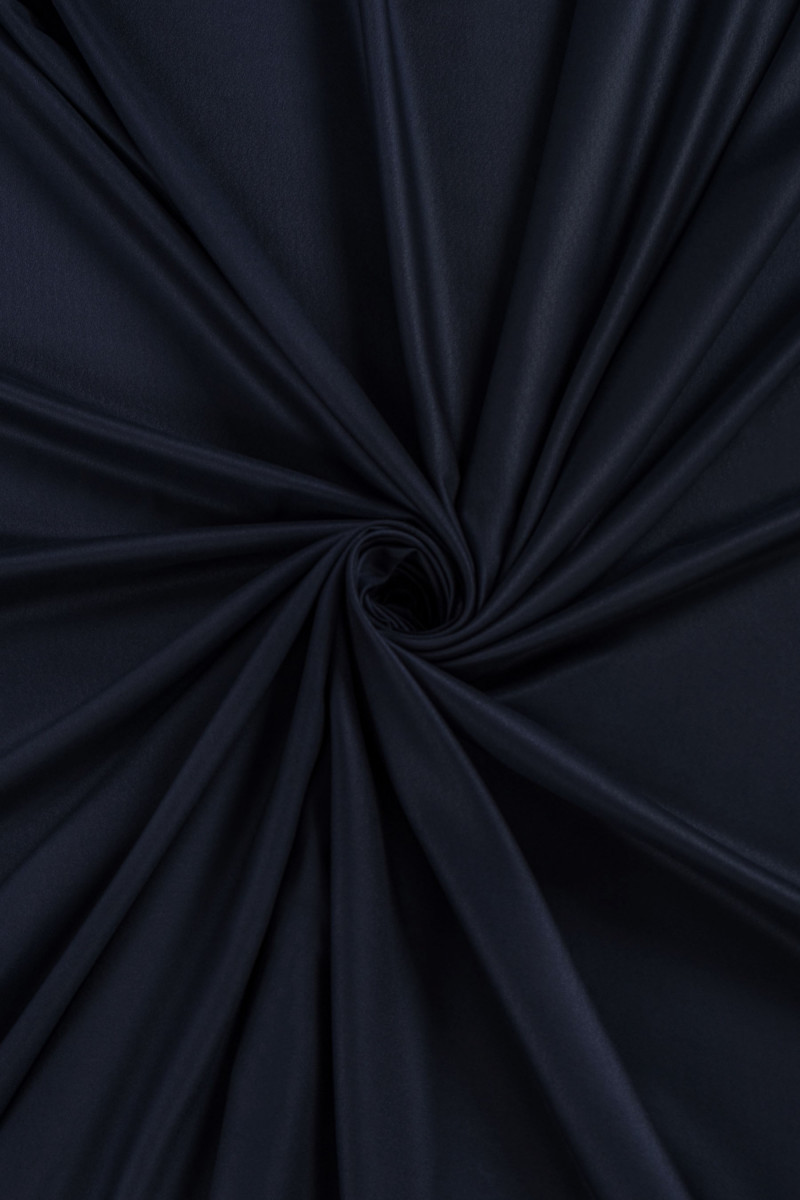 Italská kostýmová vlna v tmavě modré barvě se zajímavou, jemnou žakárovou vazbou. Měkká, tenčí, neelastická látka s krásným leskem - ideální pro šití kostýmu, obleku, kalhot, sukně, šatů.