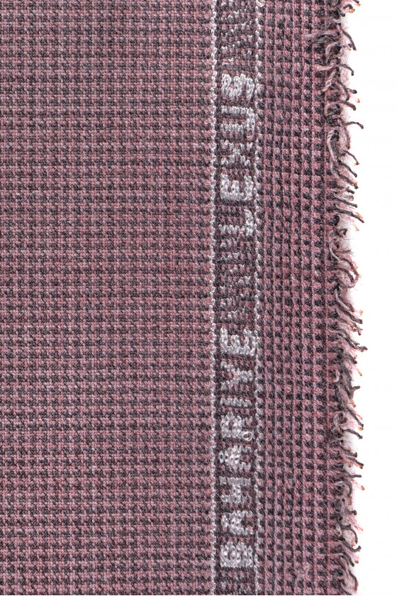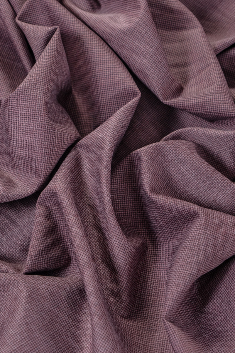 Italská kostýmová vlna v růžovo-hnědé barvě s jemným kostkovaným motivem. Tenká, mírně elastická tkanina s klasickou vazbou.