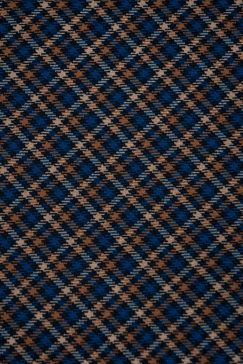 Italská kostýmová vlna s jemným károváním (0,5 cm) v černé, béžové a mořské modři. Středně silná, elastická, měkká tkanina s hustou vazbou.