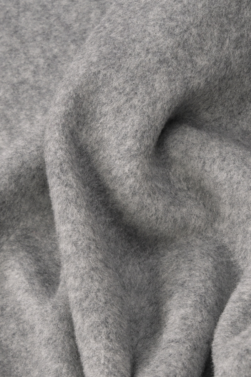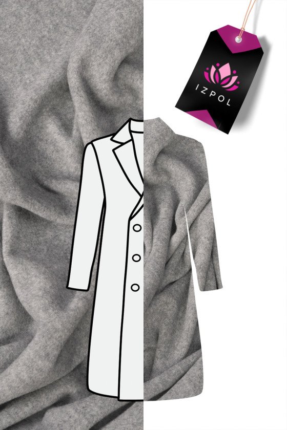 Italský kabát utkaný z přírodní vlny s přídavkem kašmíru v šedé barvě. Vlněné tkaniny jsou ideální pro svrchní oděvy (kabát, bunda, vesta), protože hřejí a zároveň umožňují pokožce dýchat. Díky přídavku kašmíru je ještě lepší izolační, protože kašmír je teplejší než ovčí vlna. Doporučuje se chemické čištění.