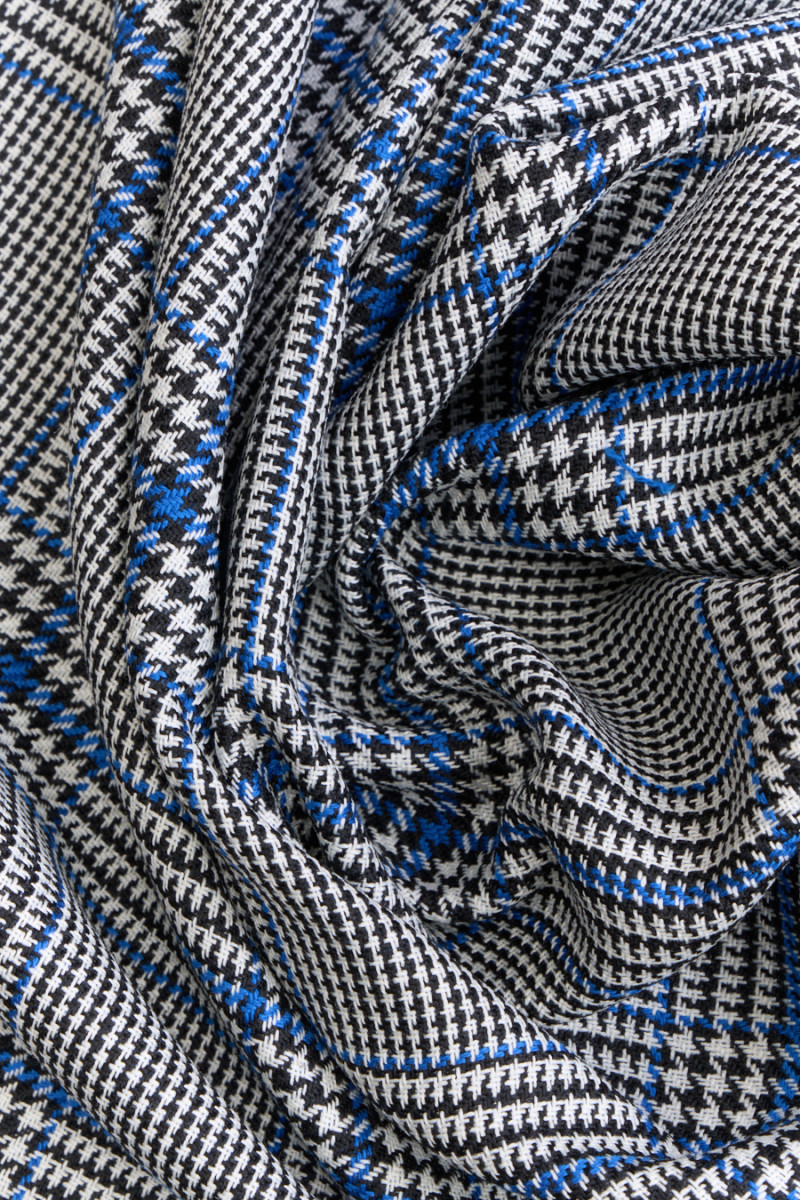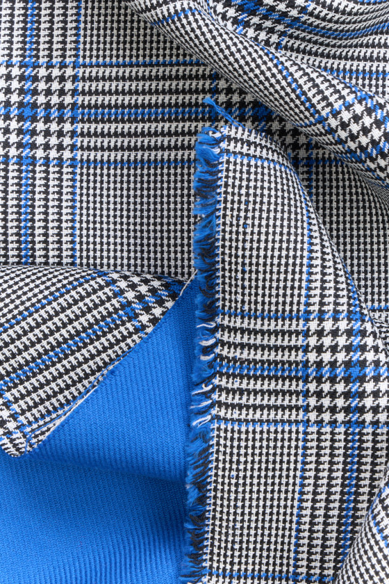 Vysoce kvalitní italská kostýmová látka s velkým modrým kostkovaným motivem na krémově černém podkladu. Silnější, neelastická tkanina, podzim-zima, oboustranná - druhá strana je vyrobena v modré barvě. Velikost mřížky 10 cm * 10 cm. Fantastický návrh na vytvoření saka, šatů nebo sukně.