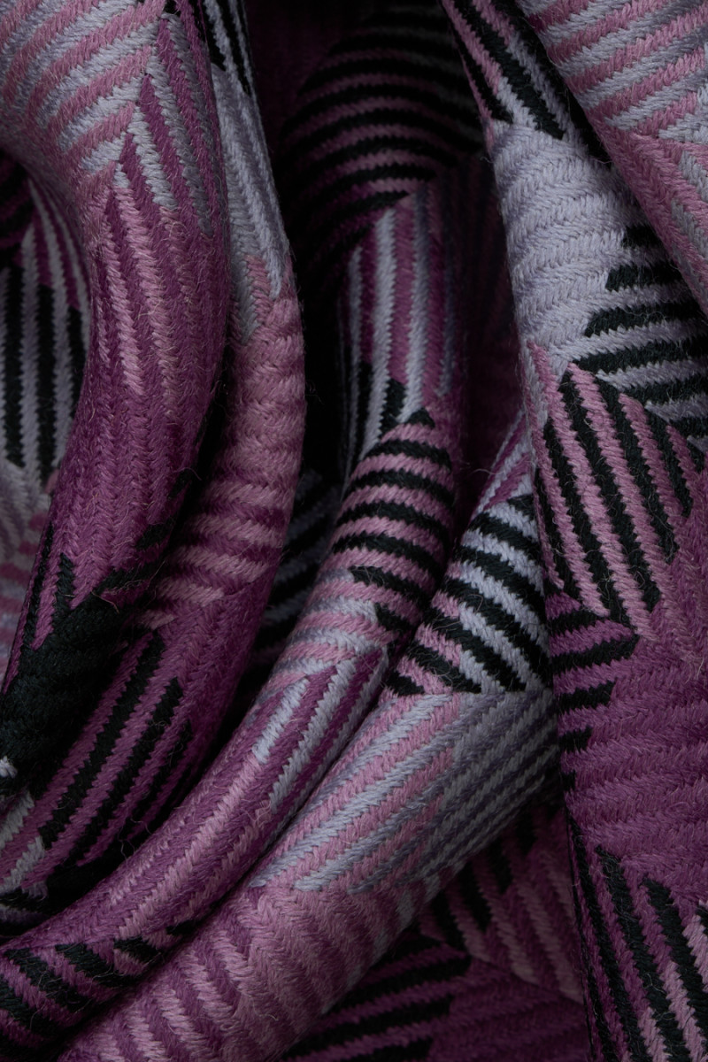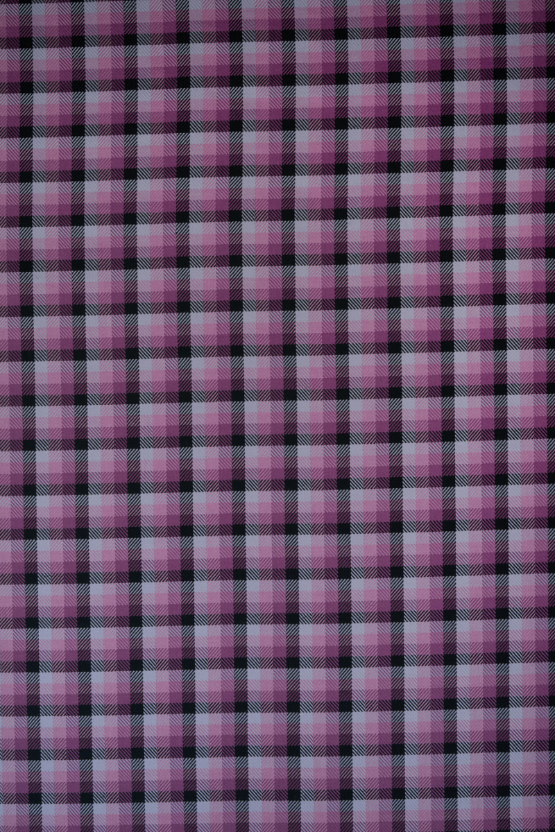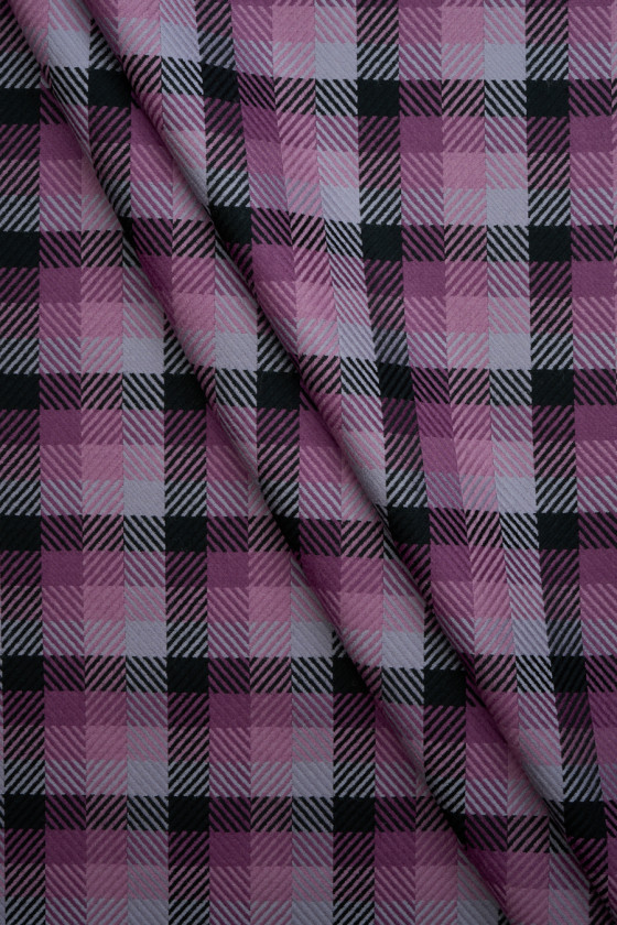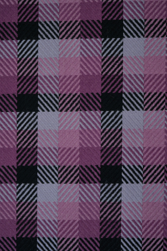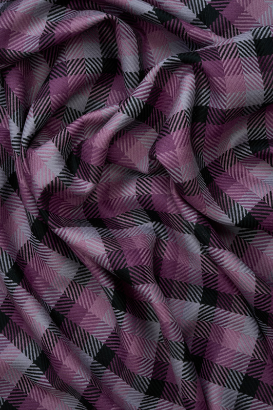 Italská 100% bižbujová vlna s károvaným motivem v odstínech fialové, lila a černé. Látka je neelastická, středně silná, měkká, pěkně sedí. Kostkovaný vzor 2 cm * 2 cm, vyplněný příčnými čarami, které vytvářejí další motiv rybí kosti na celé látce. Zajímavý návrh vlny podzim-zima na kalhoty, sukně a šaty.