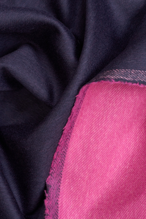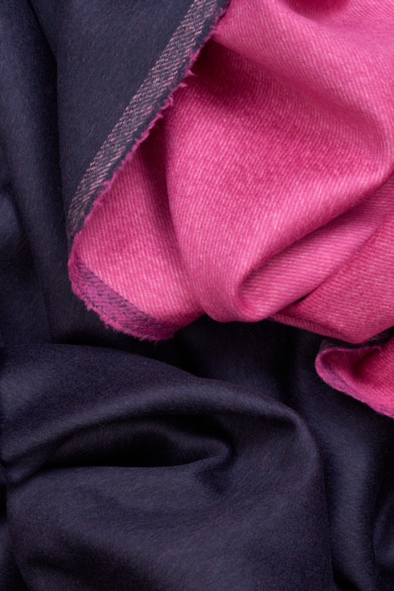 Italská kabátová tkanina utkaná z přírodní vlny s přídavkem kašmíru. Látka je oboustranná, jedna strana je vyrobena v tmavě modré barvě, druhá ve fuchsiové barvě. Vlněné látky jsou ideální pro svrchní oděvy (kabát, bunda, vesta), protože hřejí a zároveň umožňují pokožce dýchat.