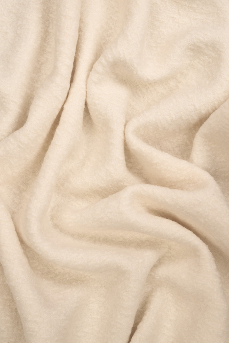 Italská tkanina boucle coat v barvě ecru. Silnější, masitá tkanina s charakteristickou strukturou, tkaná z přírodní vlny, alpaky a polyamidu. Je ideální pro svrchní oděvy, jako je kabát, bunda, vesta. Doporučuje se chemické čištění.