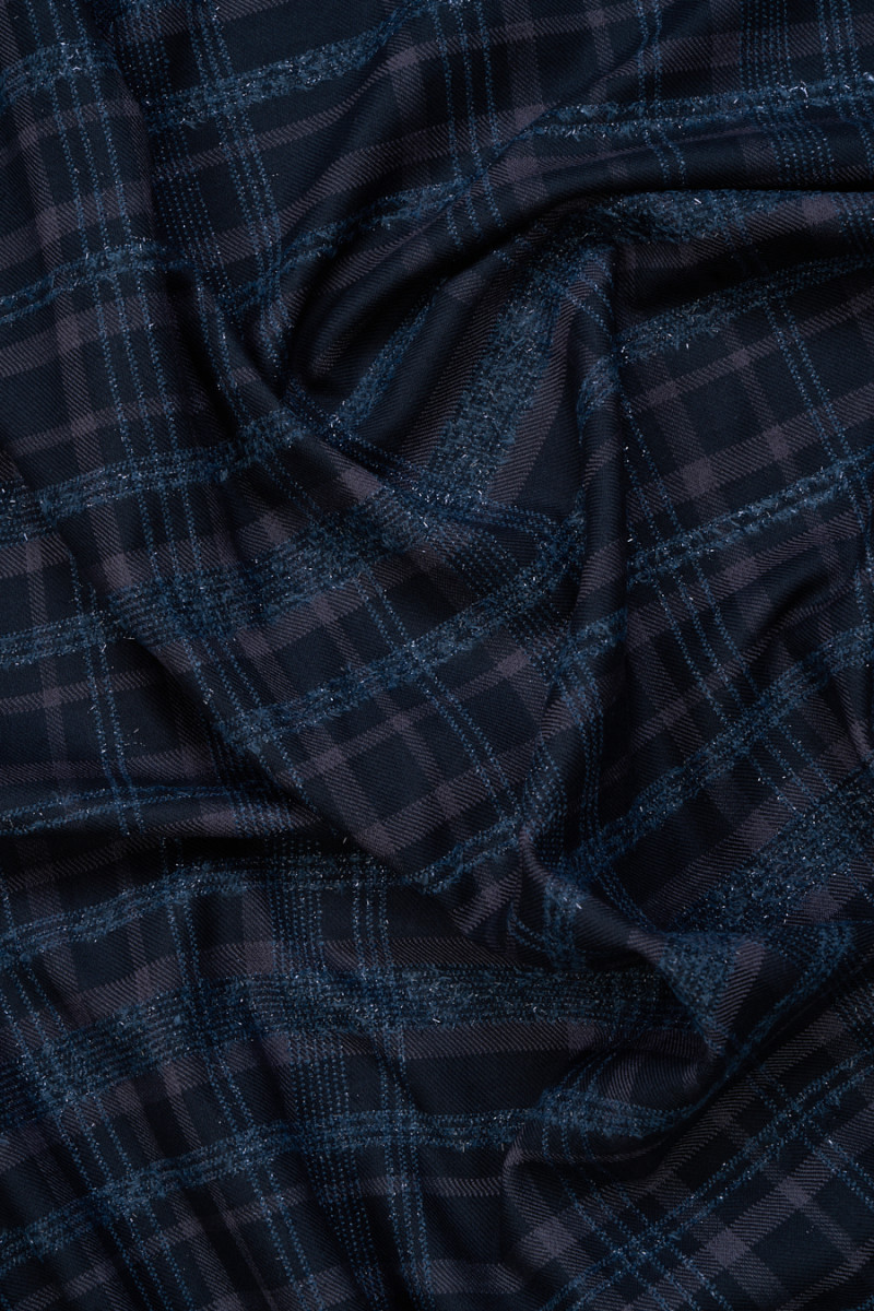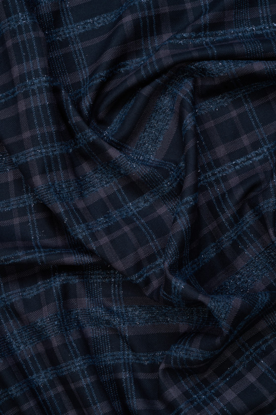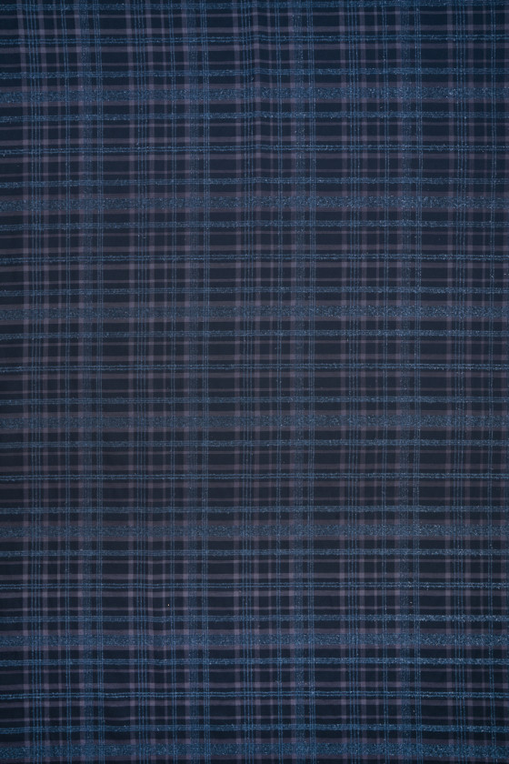 Italská krojová látka utkaná z bavlny a vlny v tmavě zelené, modrozelené barvě. Klasický kostkovaný vzor v tmavě šedé barvě, který je obohacen o lesklou nit v tmavě modrozelené barvě. Látka je měkká, lehká, neelastická a dobře sedí. Ideální pro šití kostýmu, obleku, kalhot, sukně, šatů.