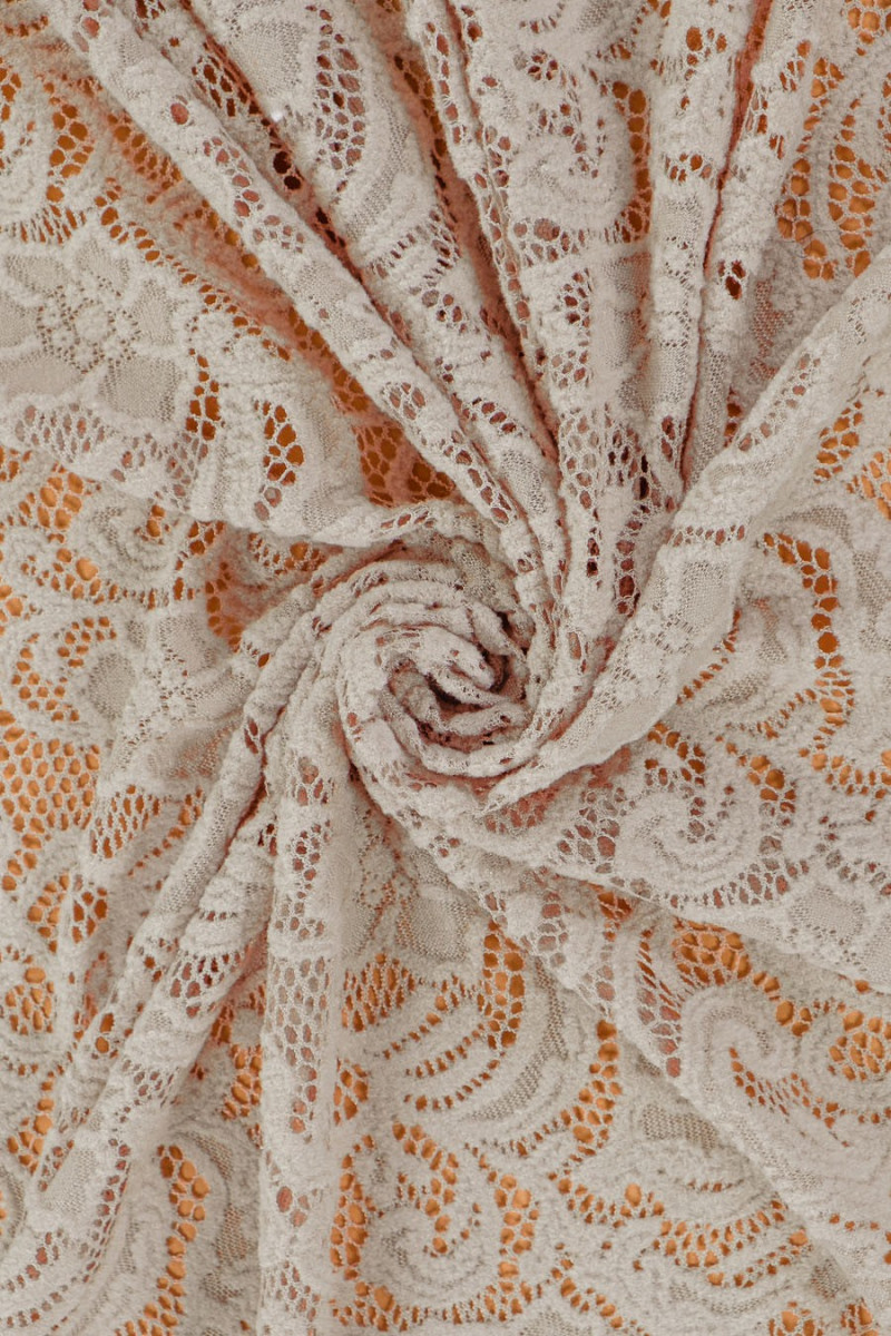 Studená béžová krajka s vypouklým květinovým vzorem - působí dojmem, že je vyrobena z vlny.