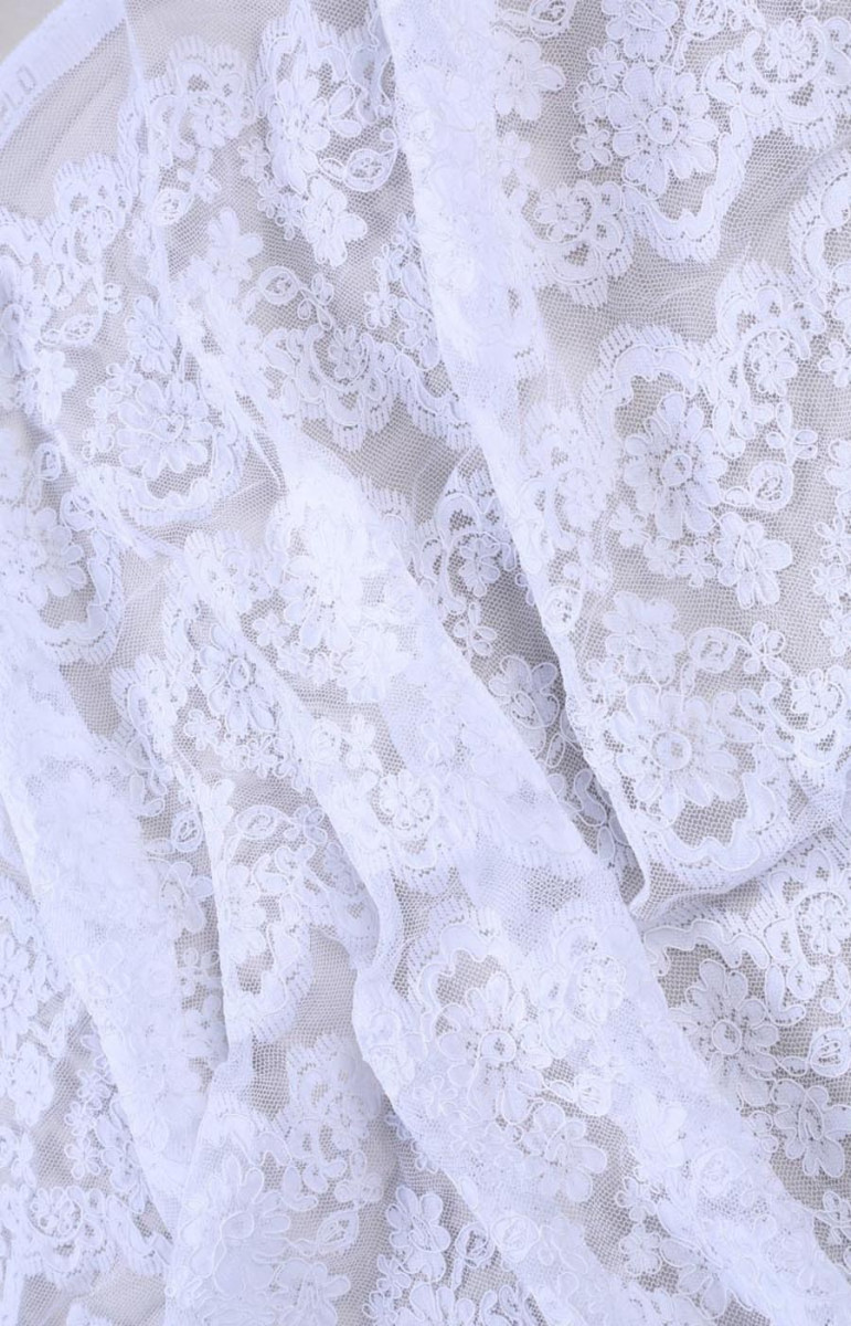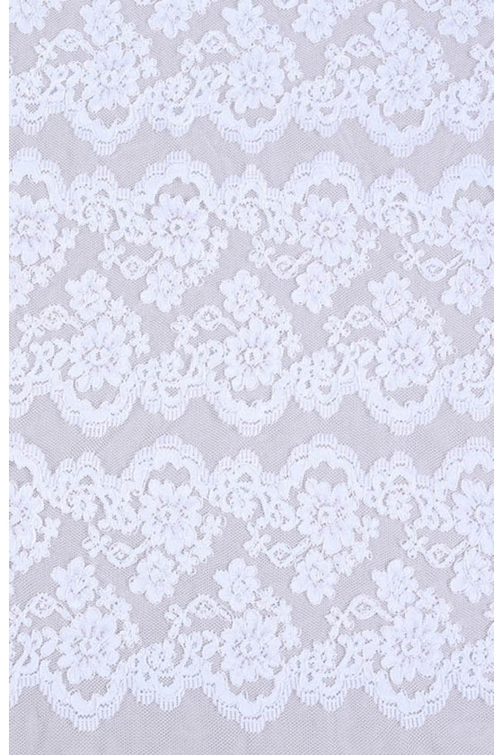 Krajka určená ke svatebním šatům nebo halenkám. Jsou na něm pravidelné pruhy, které lze stříhat. Neelastická tkanina.