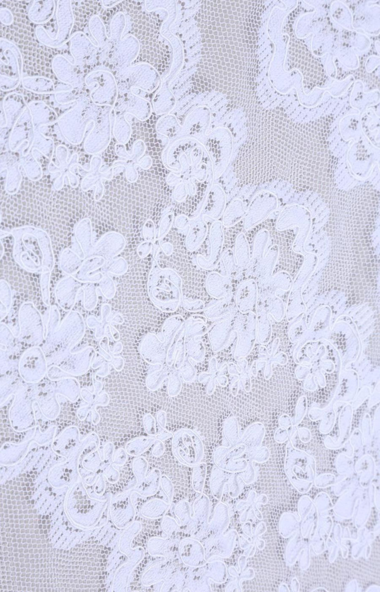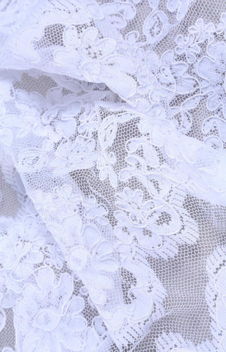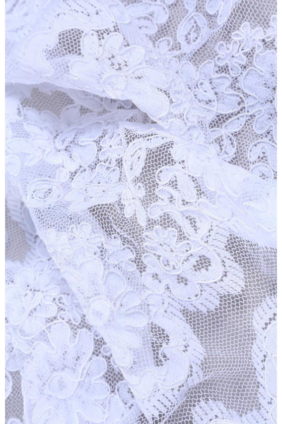 Krajka na svatební šaty nebo halenky. Jsou na něm pravidelné proužky, které lze řezat. Neelastická tkanina.
