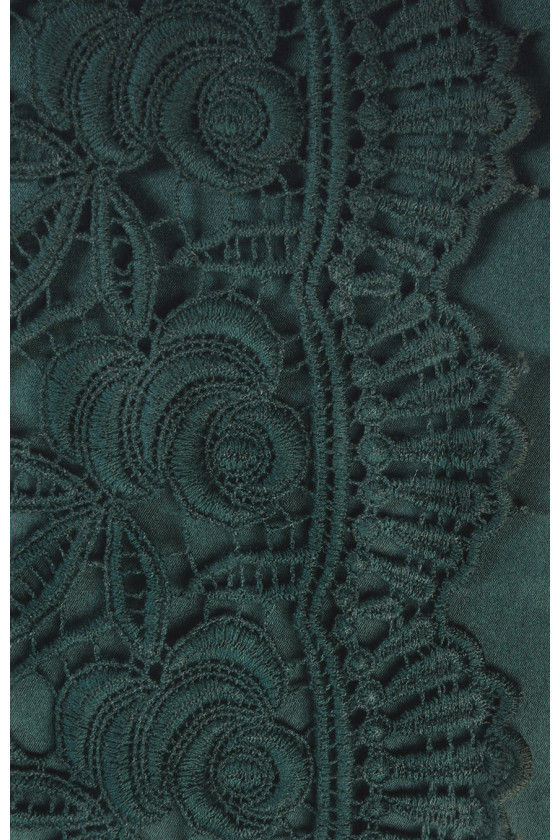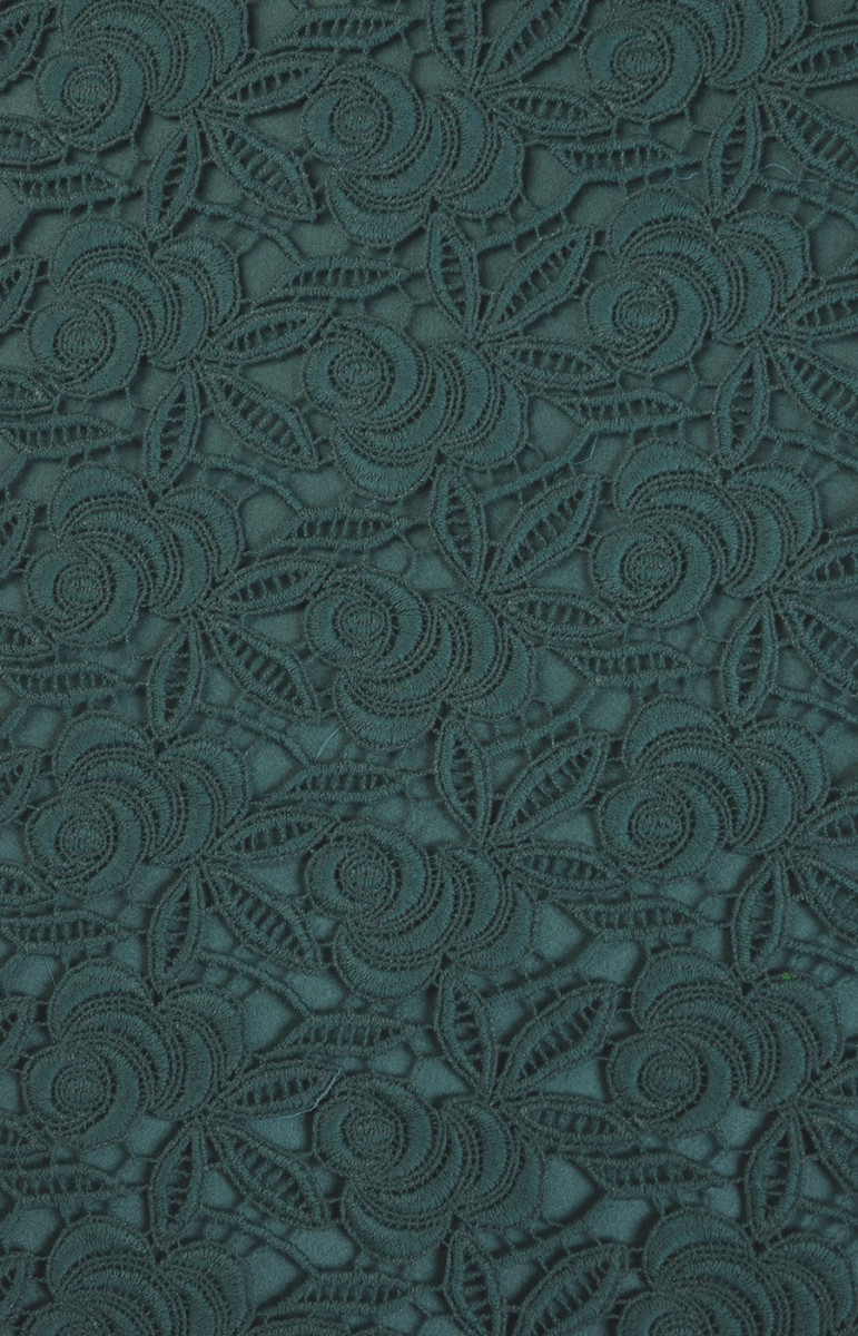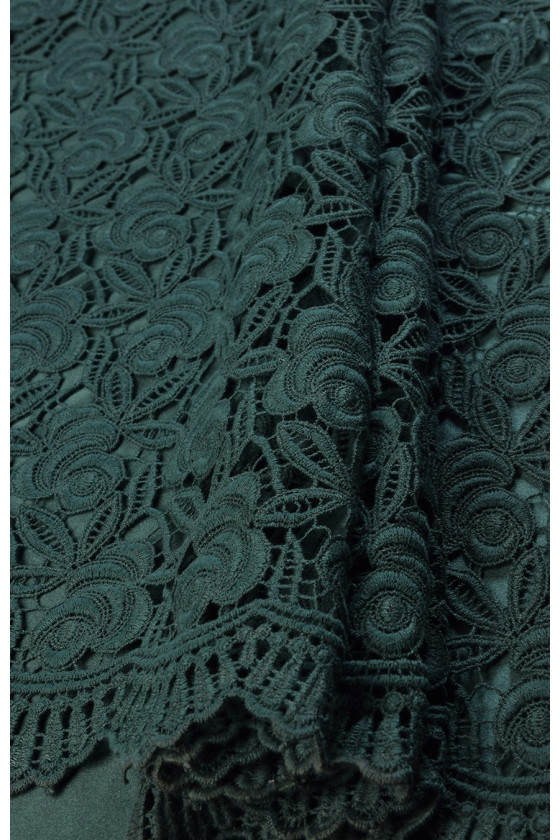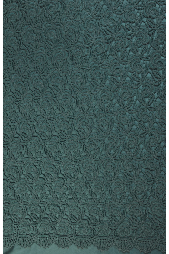 Guipure krajka s klasickým vzorem v mořské zeleni. Pro krásný efekt doporučujeme zvolit podšívku, např. z hedvábného saténu.