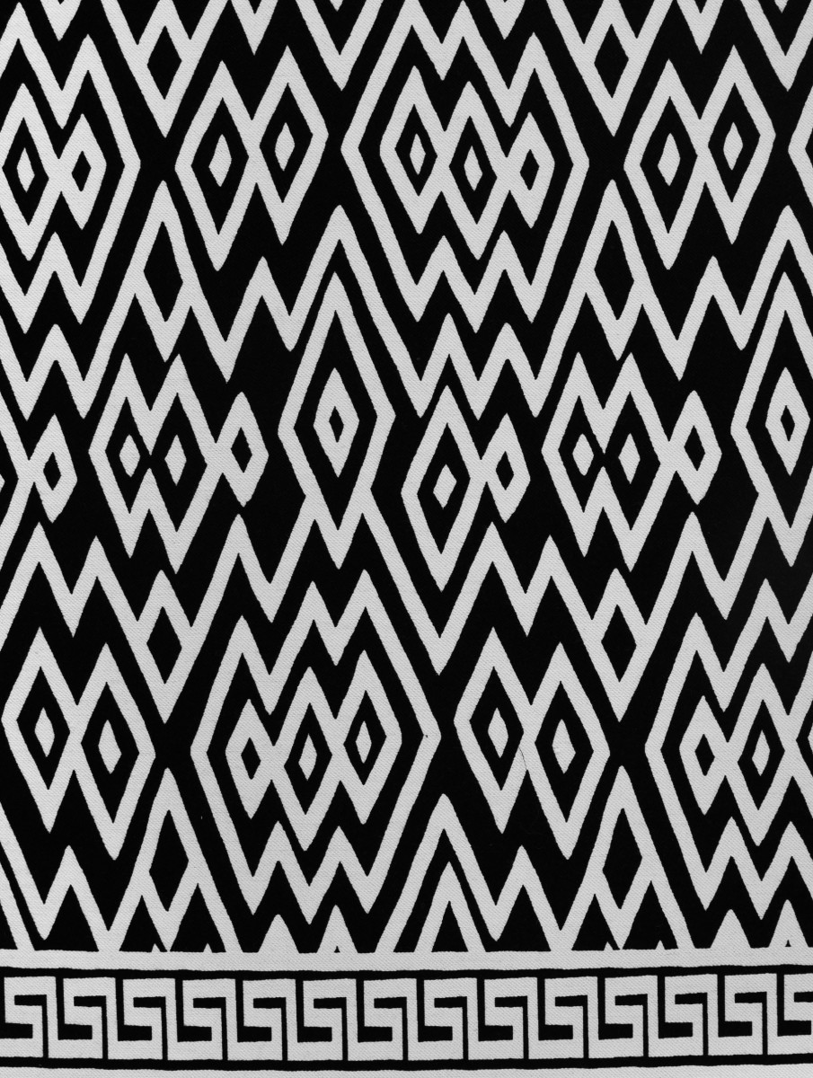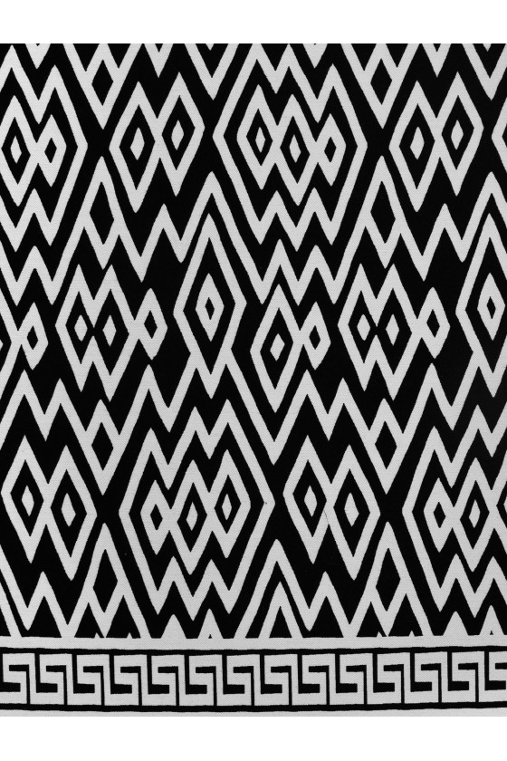 Italská kabátová látka ve velikosti kupónu 190cm*145cm. Kupón s krémovým a černým klikatým motivem zakončený ozdobným okrajem - lze jej přišít z obou stran. Silnější, tuhá tkanina s keprovou vazbou - směs přírodní vlny a hedvábí.