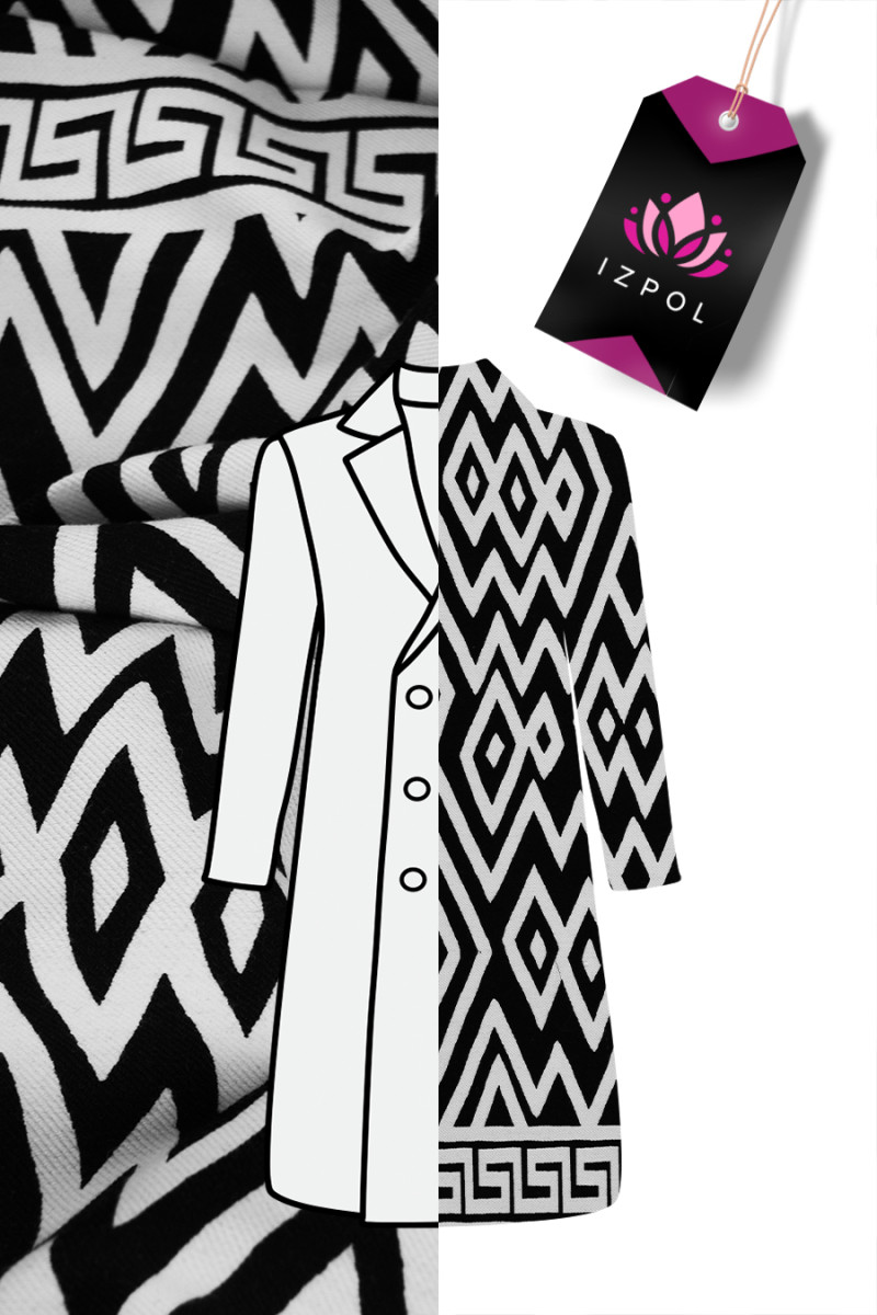 Italská kabátová látka ve velikosti kupónu 190 cm * 145 cm. Kupón s krémovým a černým klikatým motivem zakončený ozdobným okrajem - lze jej přišít z obou stran. Silnější, tuhá tkanina s keprovou vazbou - ideální pro šití kabátu nebo bundy. Vlněné látky jsou ideální pro svrchní oděvy (kabát, bunda, vesta), protože hřejí a zároveň umožňují pokožce dýchat. Doporučujeme chemické čištění.