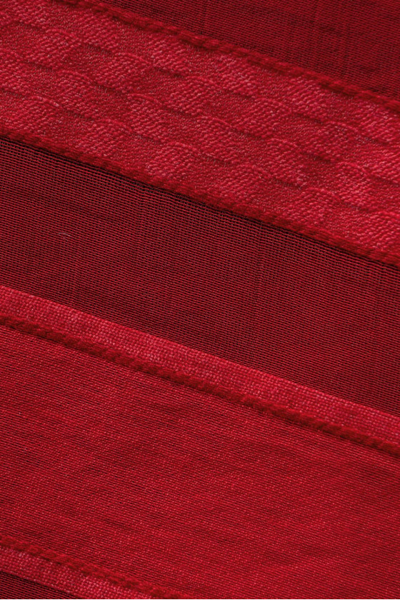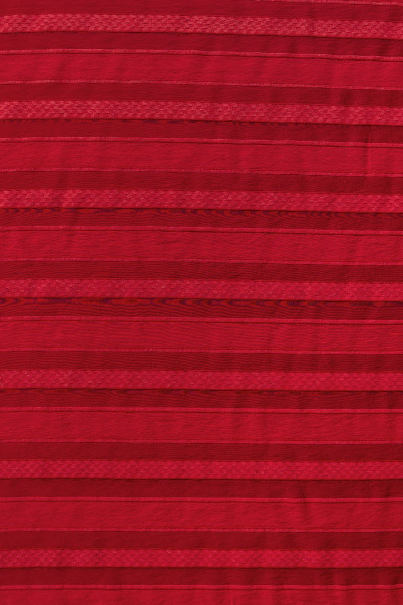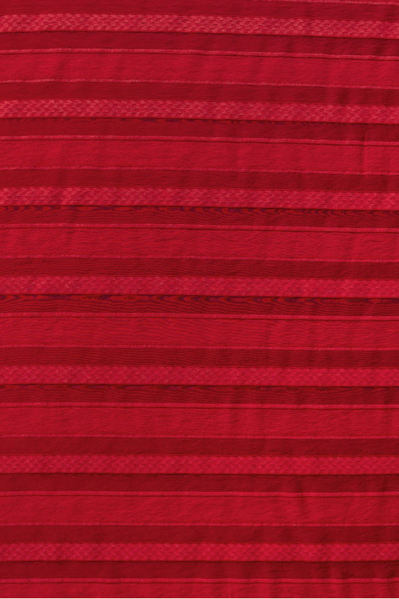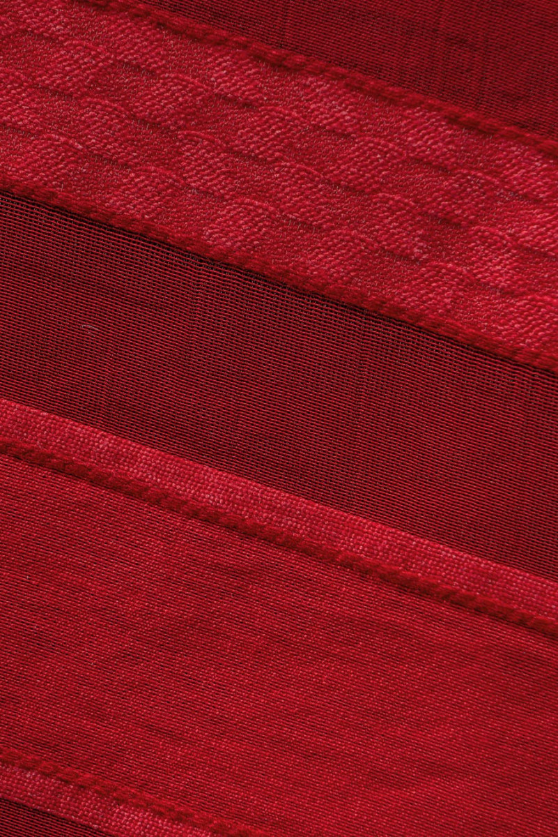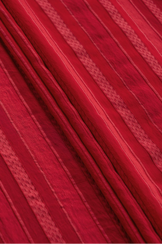 Červená, polyesterová organza s pruhy šíře 2 a 4 cm. Celek vytváří zajímavý efekt poloprůhledné tkaniny se stabilní strukturou.