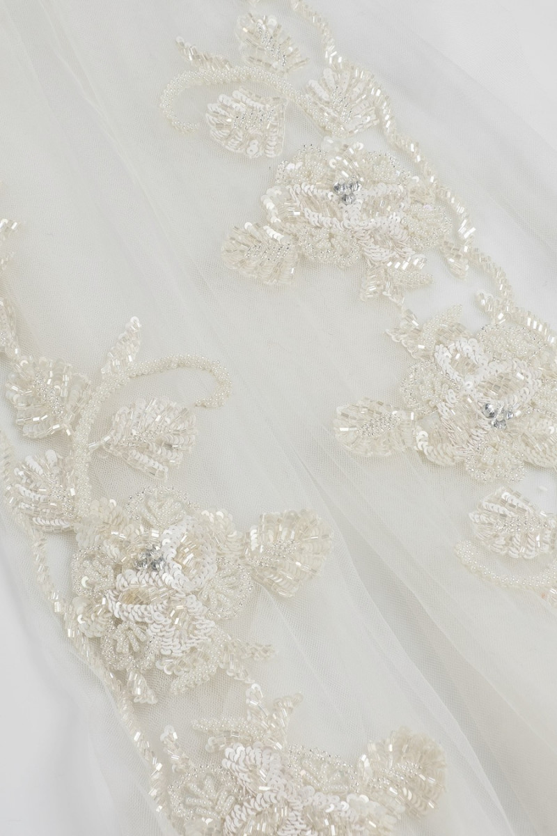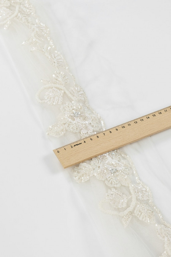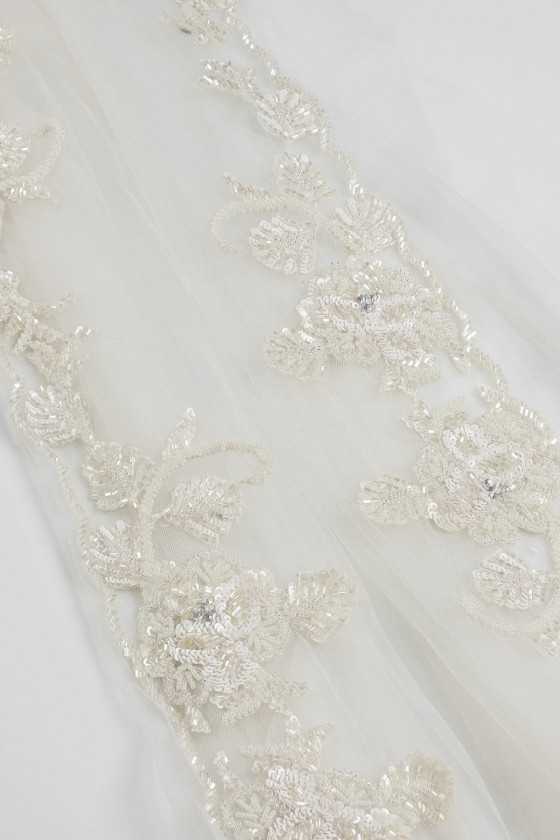 Italská galanterní páska v barvě ecru. Korálky a flitry ve formě květů a listů jsou našité na měkkém tylu. Ideální pro dokončování svatebních a večerních šatů.