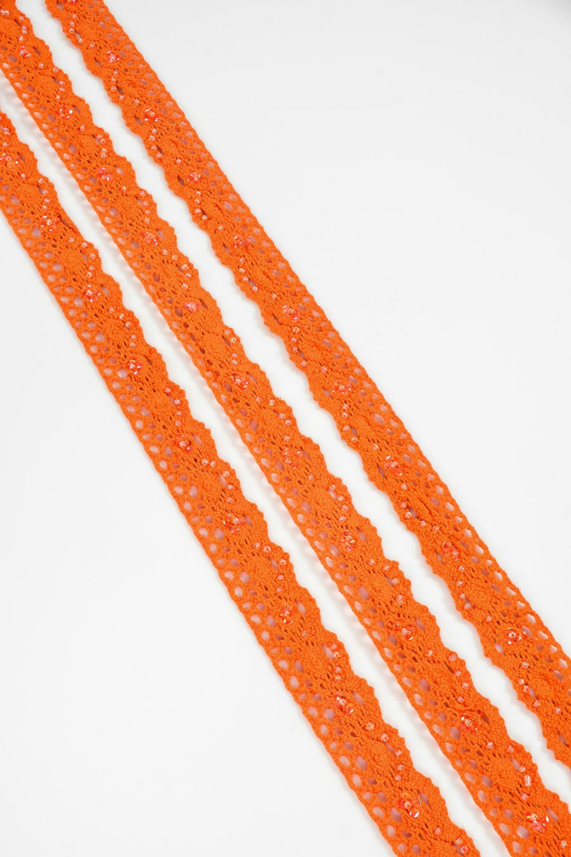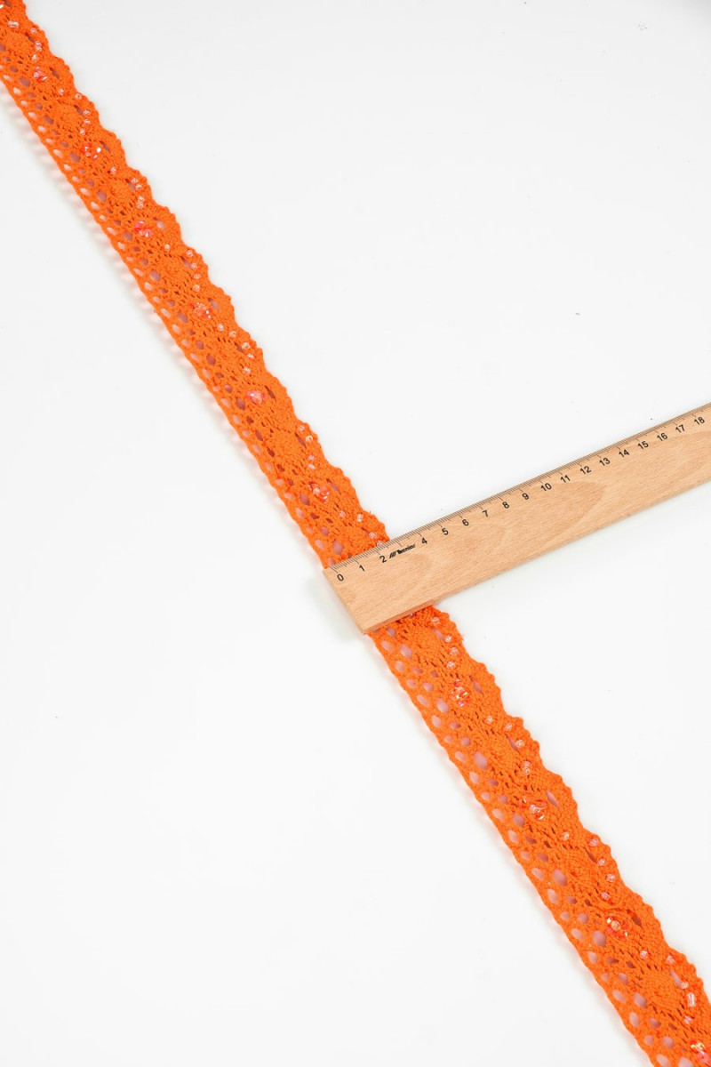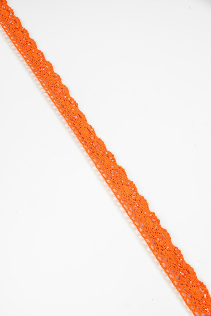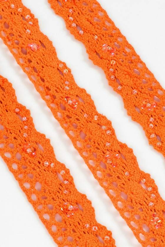 Galanterní páska v oranžové barvě s korálky. Zakončeno zubem na jedné straně, efekt "háčkování".