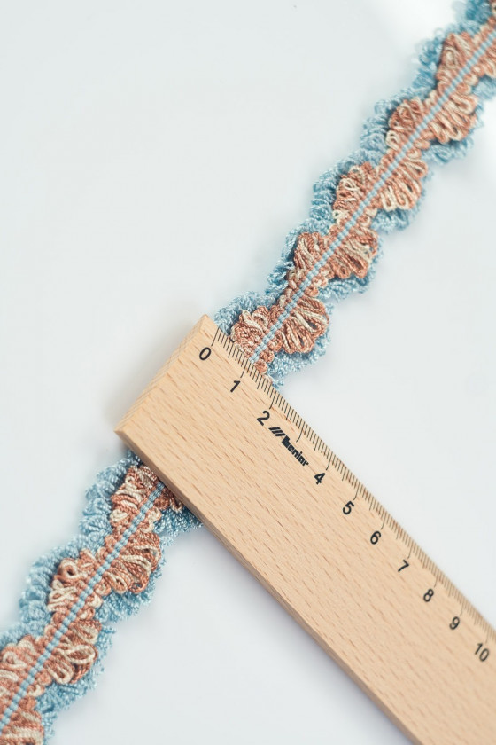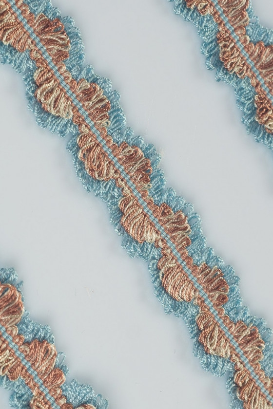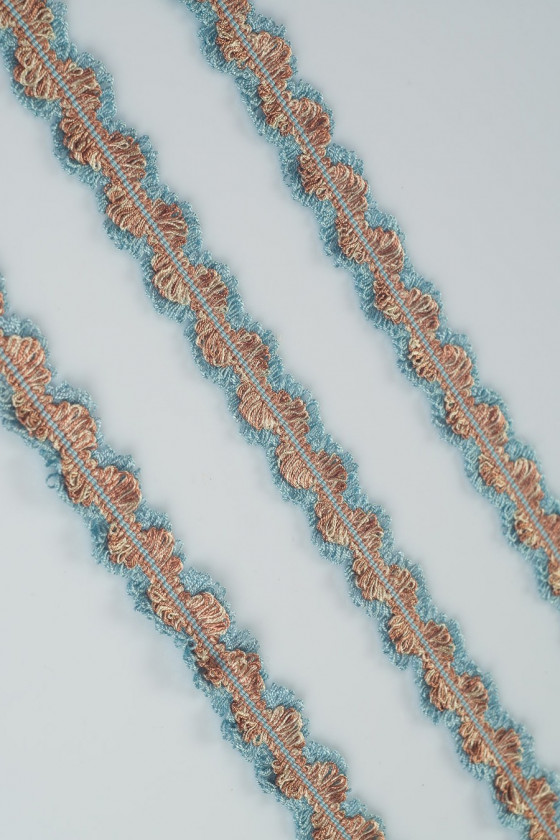 Galanterní páska ze dvou propletených provázků - červené a světle modré.