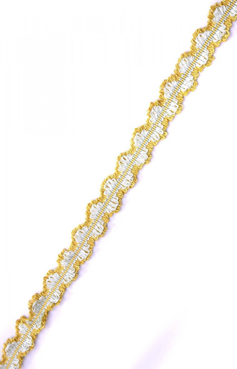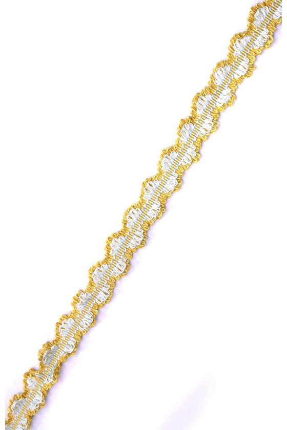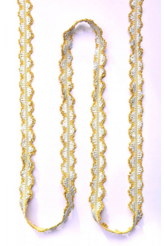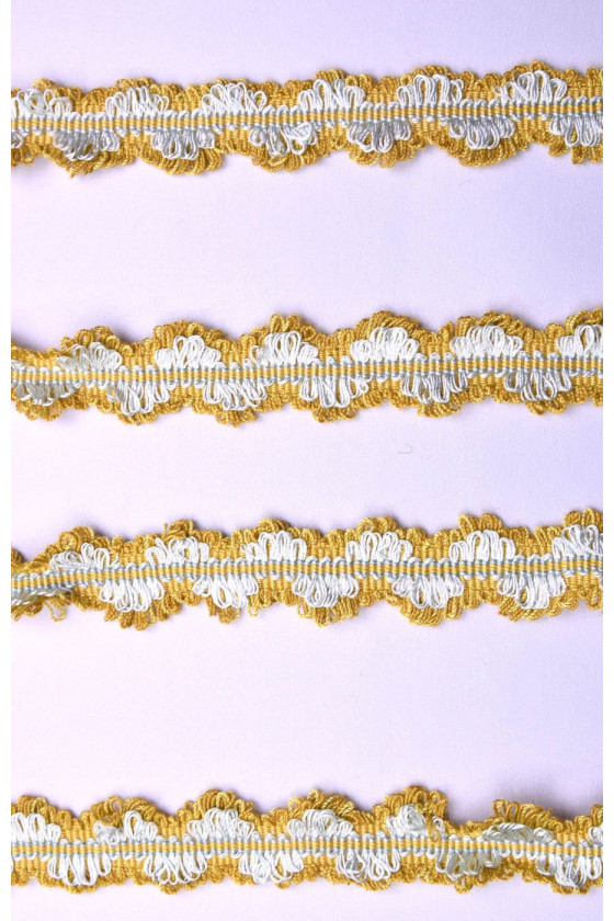 Galanterní páska pro konečnou úpravu oděvů v akvamarínové a hořčičné barvě.