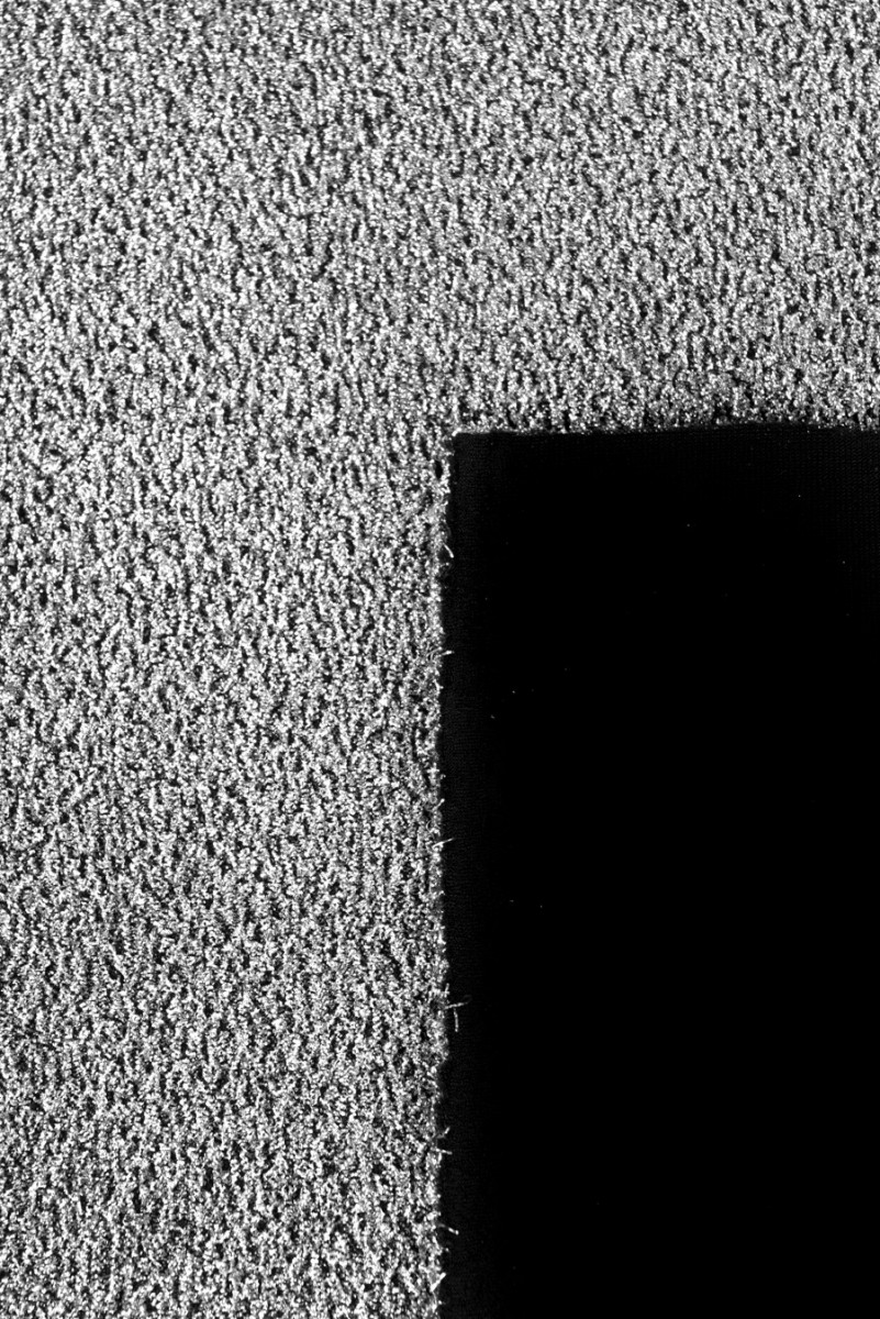 Polyesterový úplet stříbrné barvy s žoržetovou vazbou lurexové nitě. Tkanina je mírně elastická, neprůhledná, velmi efektní, stříbrná nit vytváří mírně konvexní strukturu. Ideální nabídka pro halenky, šaty, sukně vycházkového a jevištního charakteru.