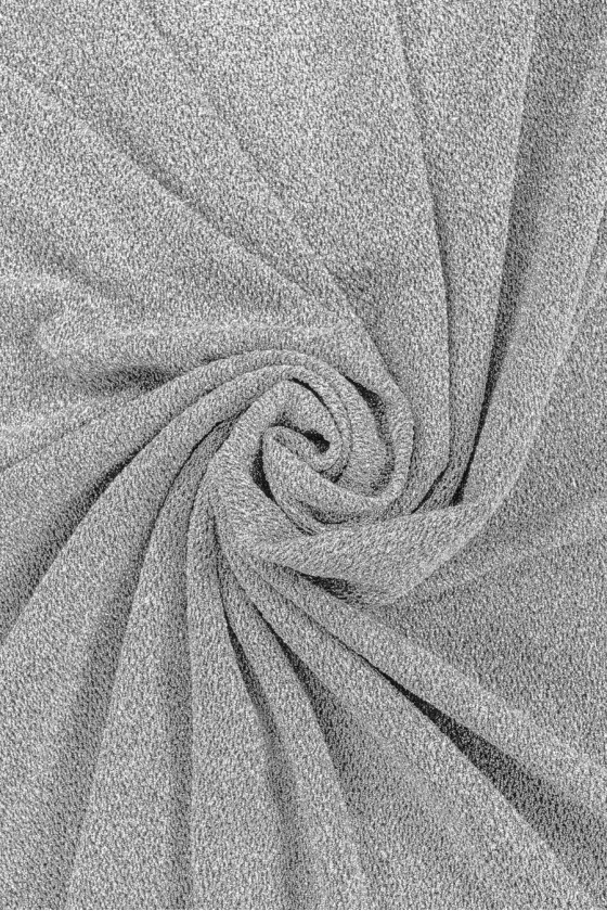 Italská polyesterová pletenina stříbrné barvy s žoržetovou vazbou lurexové nitě. Tkanina je mírně elastická, neprůhledná, velmi efektní, stříbrná nit vytváří mírně konvexní strukturu. Ideální nabídka pro halenky, šaty, sukně vycházkového a jevištního charakteru.