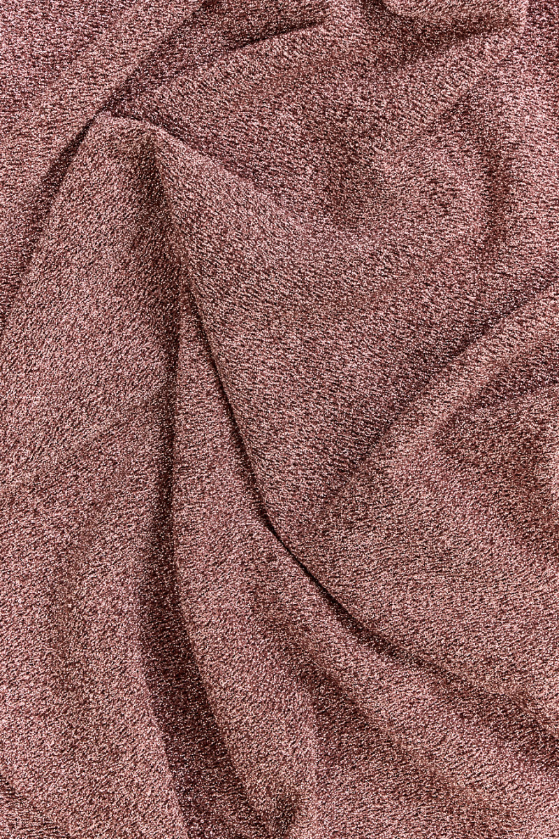 Italský polyesterový úplet měděné barvy s kapkou růžové, s žoržetovou vazbou lurexové nitě. Tkanina je mírně elastická, neprůhledná, velmi účinná, měděná nit vytváří mírně konvexní strukturu. Ideální nabídka pro halenky, šaty, sukně vycházkového a jevištního charakteru.