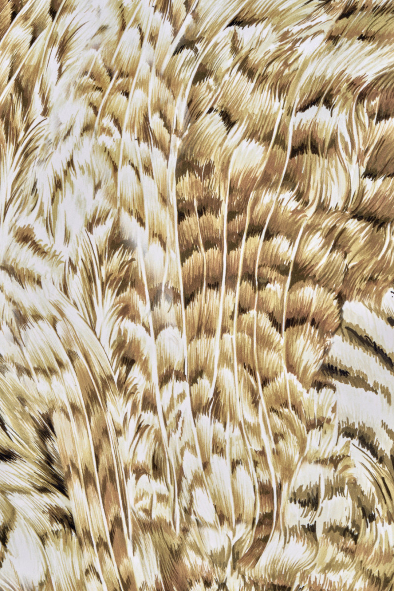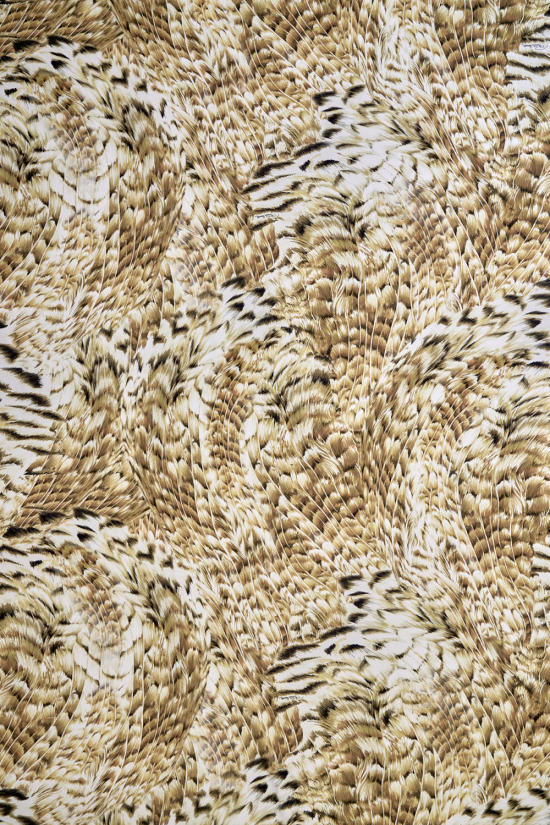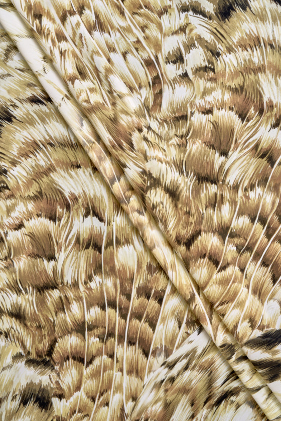Italský polyamidový úplet s ptačím peřím v béžové, krémové a hnědé barvě. Velký, hustý vzor v teplých, tlumených barvách, navíc podepsaný jménem známé módní značky. Pletenina je elastická, chladivá na dotek, neprůhledná a splývavá. Skvělá nabídka na ušití letní halenky nebo šatů pro fanoušky značkových látek.