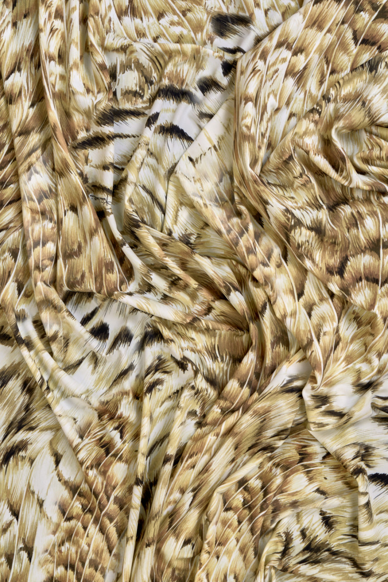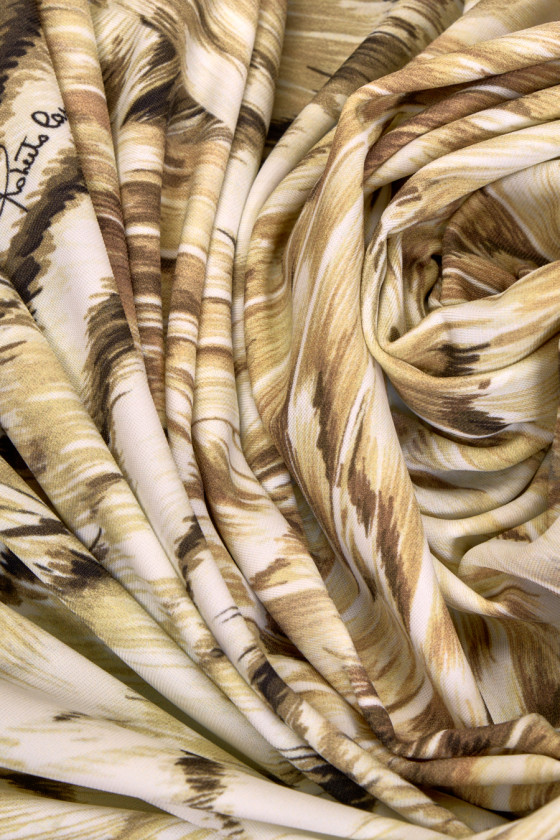 Italský polyamidový úplet s ptačím peřím v béžové, krémové a hnědé barvě. Velký, hustý vzor v teplých, tlumených barvách, navíc podepsaný jménem známé módní značky. Pletenina je elastická, chladivá na dotek, neprůhledná a splývavá. Skvělá nabídka na ušití letní halenky nebo šatů pro fanoušky značkových látek