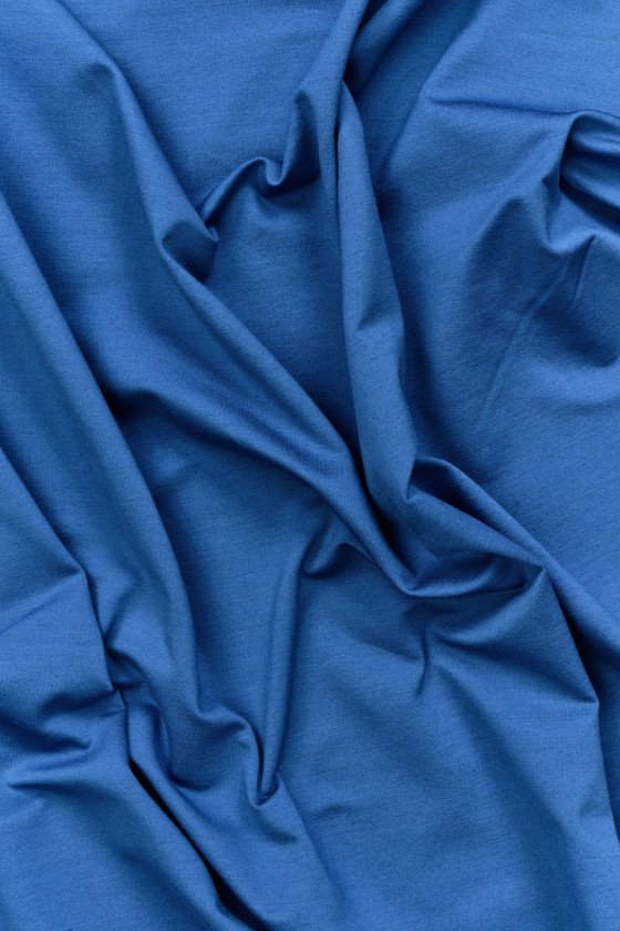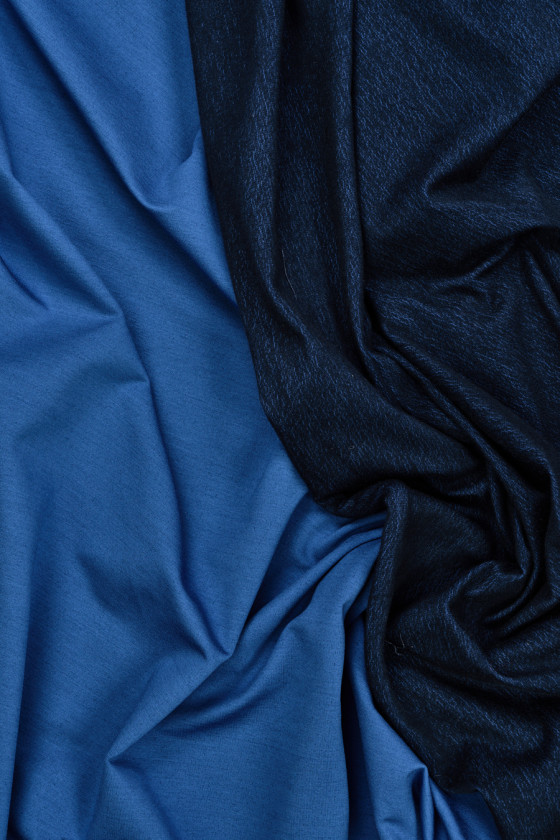 Italská oboustranná teplákovina - z jedné strany modrá, z druhé tmavě modrý melír. Materiál je neprůhledný, elastický, střední tloušťky a lze jej šit bez podšívky. Skvěle se hodí na každodenní oblečení, jako jsou mikiny, bundy, šaty, kalhoty.