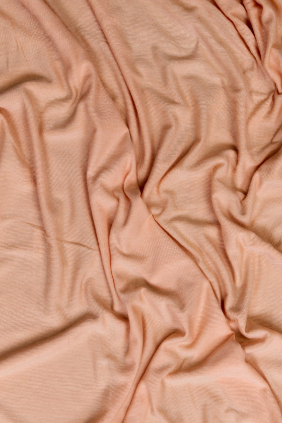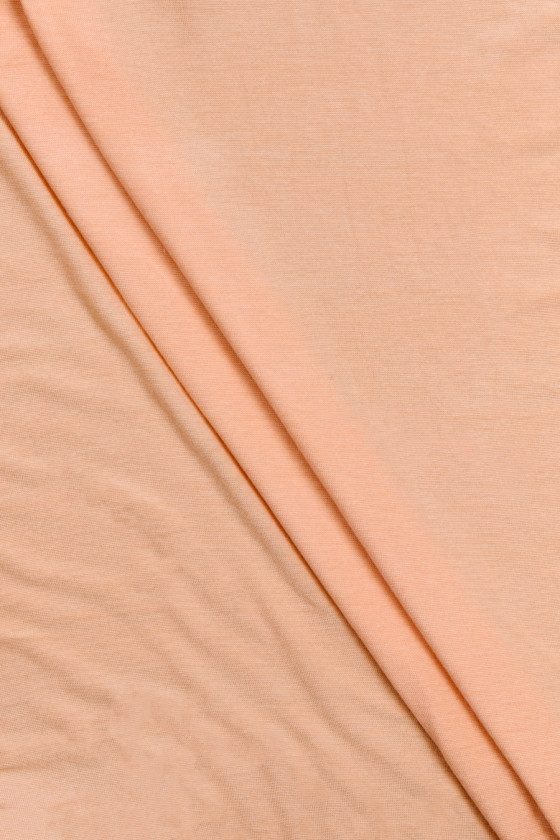 Italský svetrový úplet tkaný ze 100% viskózy v meruňkové barvě. Pletenina je střední tloušťky, s mírně volnou vazbou, měkká a elastická. Doporučujeme k halenkám, tričkům a lehkým svetrům.