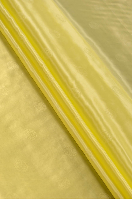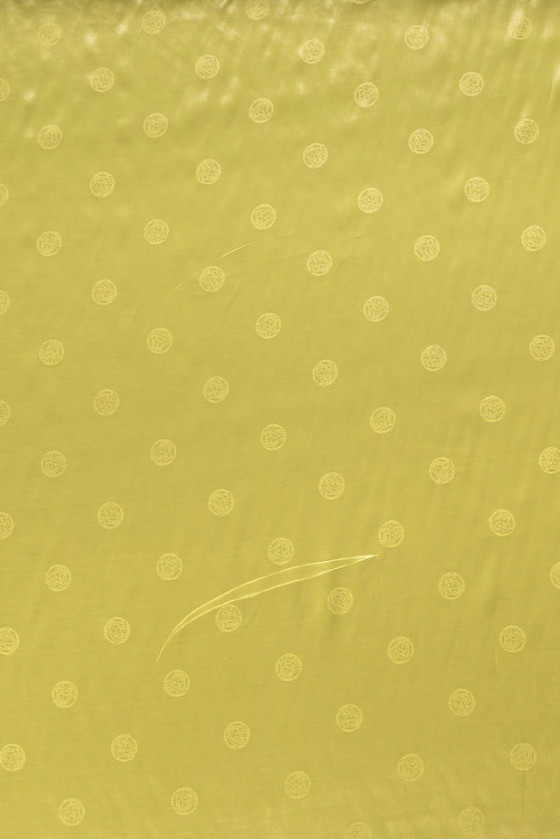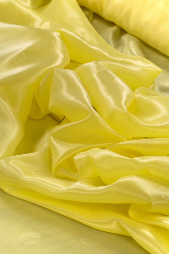 Podšívka z italské viskózy ve žluté barvě. Signováno logem známého módního domu. Látka je měkká, mírně lesklá. Podšívka neobsahuje elastan, ale mírně působí na vlákna. Ideální pro podšívku kabátů, bund, vest, bund.