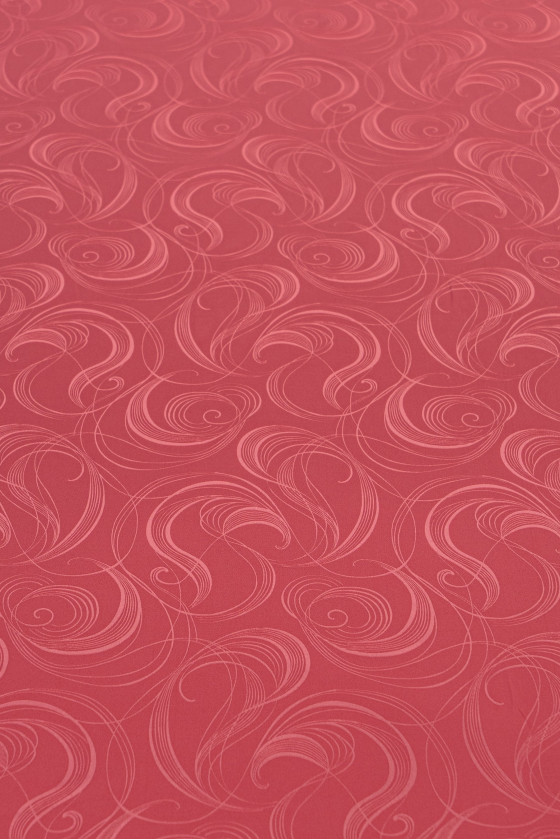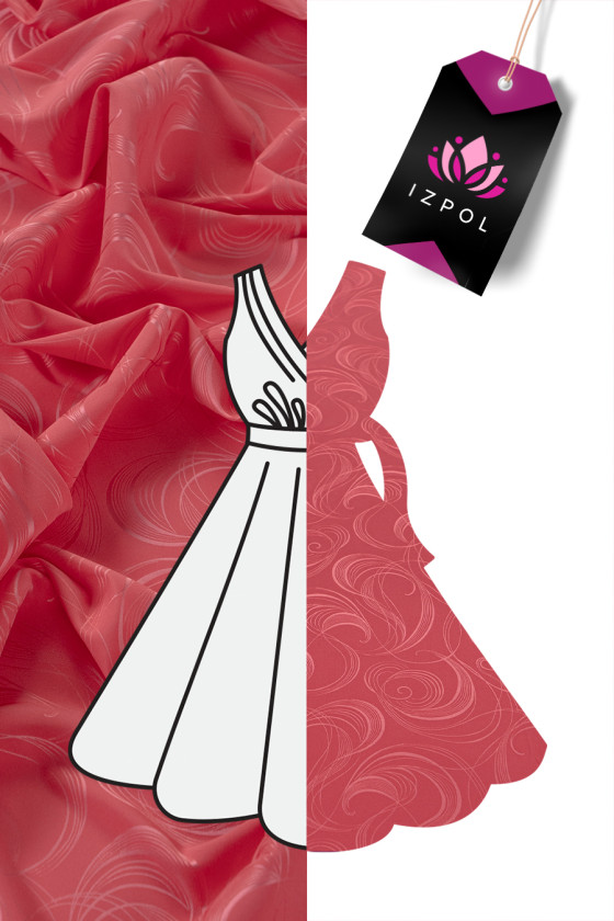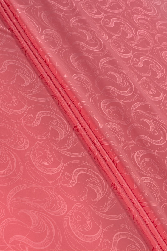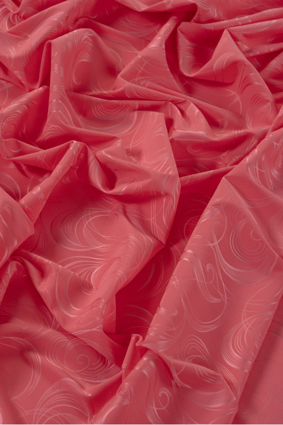Italský polyesterový satén v korálové barvě s motivem efektních vzorů - velmi elastický. Satén je hustá a lehká tkanina s rovným povrchem, vyrobená v saténové vazbě. Další výhodou je jeho hladkost a odolnost, stejně jako skutečnost, že velmi dobře sedí, neprosvítá a je příjemný na dotek. Na jedné straně je matný a na druhé straně je ušlechtile lesklý.
