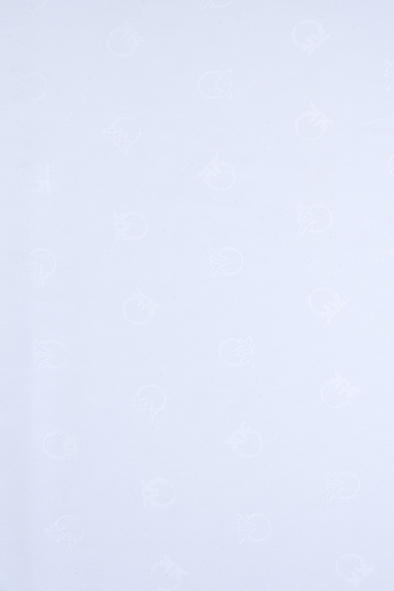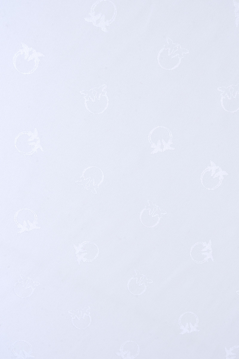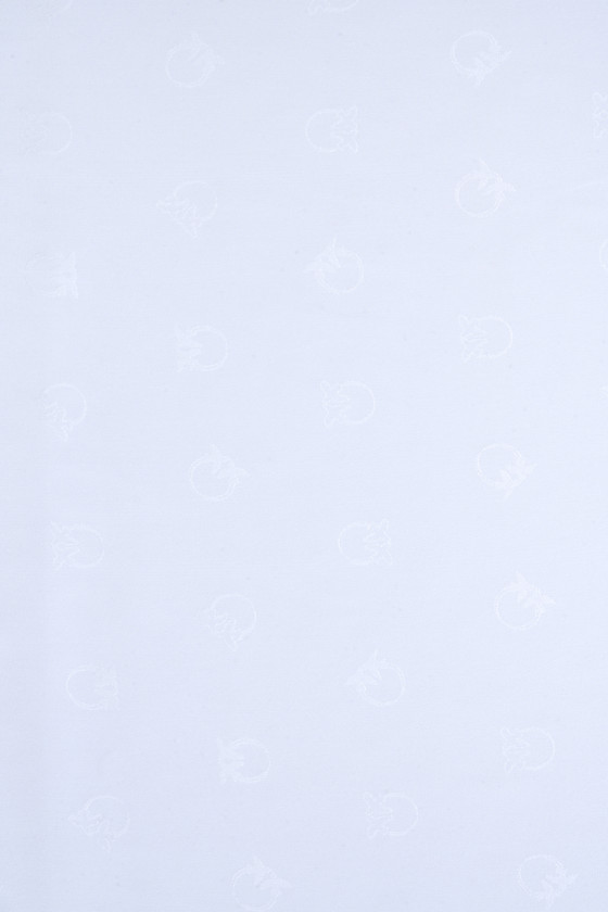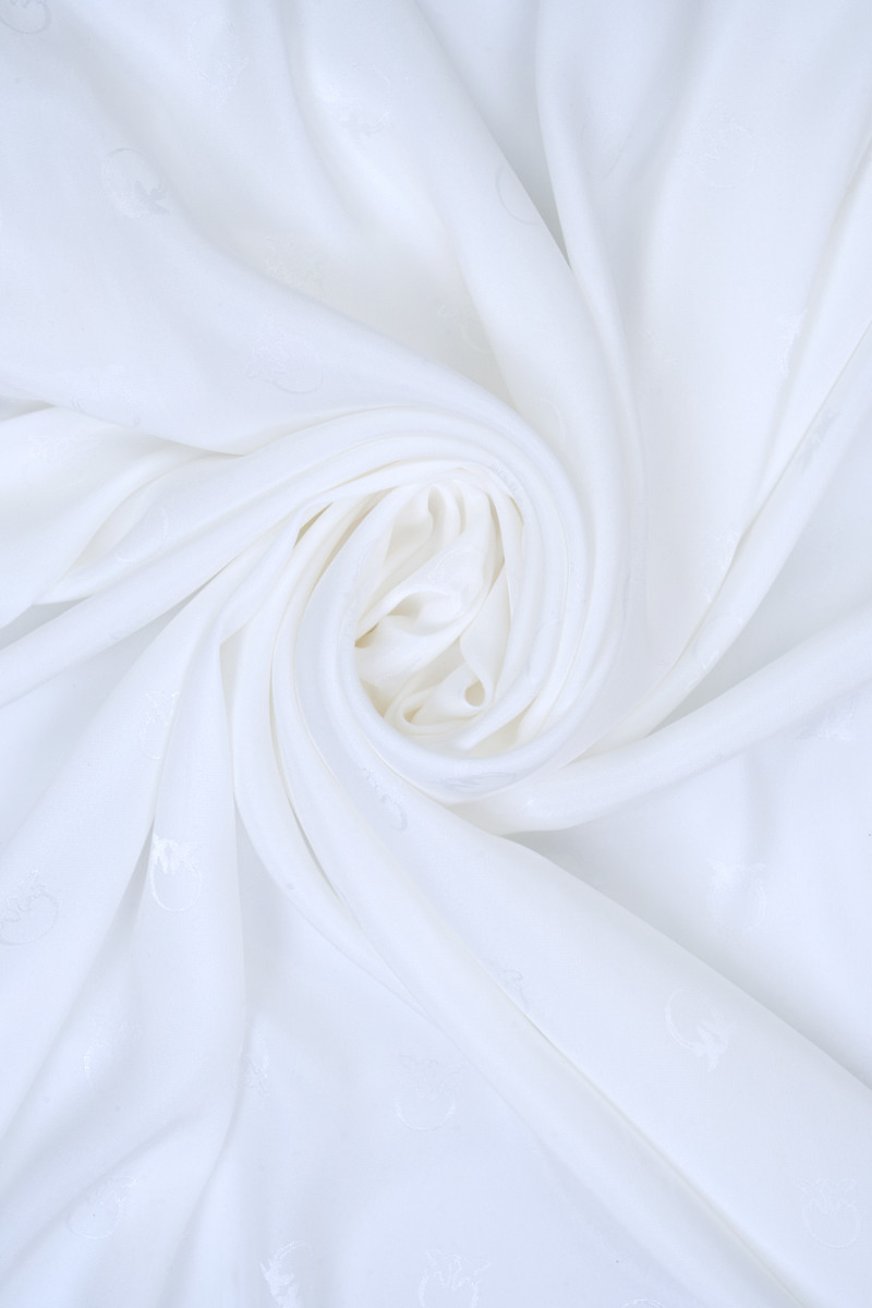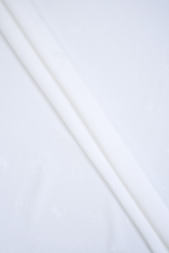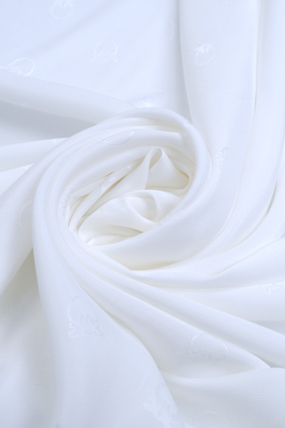 Italský polyesterový satén krémové barvy s žakárovými vzory, dotýkající se ptáků ve stejné barvě. Motiv má průměr asi 2 cm a je hustě rozložen na látce, jedná se o logo známého módního domu. Látka je neelastická, tenká, ale neprůhledná se saténovým leskem, měkce splývá. Ideální nabídka pro lidi, kteří mají rádi značkové vzory v klasických barvách.