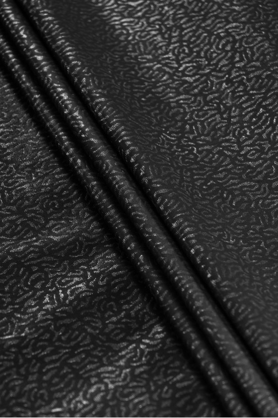Italská, originální viskózová látka v černé a stříbrné barvě se zvířecím potiskem. Látka je mírně tuhá, těsná, pracuje jemně. Doporučeno pro šití bund, bund nebo jako dekorační látka