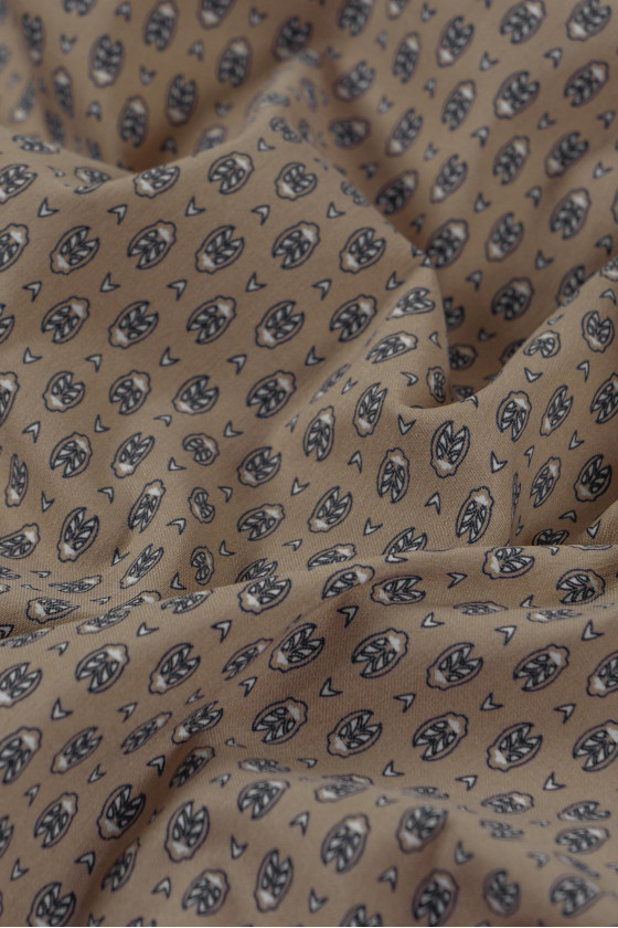 Italská látka v šedobéžové barvě s drobnými vzory - matná, mírně tuhá, velmi elastická látka. Ideální pro šití úzkých kalhot, sukně, bundy, vypasovaných šatů.