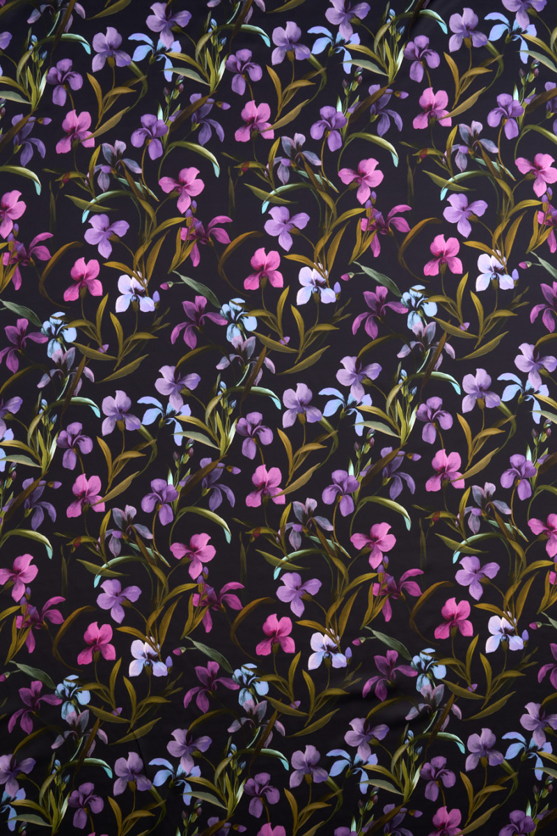 Italský viskózový satén s motivem barevných květů a podlouhlých listů na černém podkladu. Hustě umístěný květinový vzor vyrobený v odstínech fialové, fuchsiové a zelené, květy o velikosti asi 7 cm * 7 cm. Látka je neelastická, splývavá, jemná na dotek, měkká a krásně sedí. Fantastická nabídka pro lidi, kteří hledají jedinečné a zajímavé materiály pro košile, sukně, šaty nebo šátky.