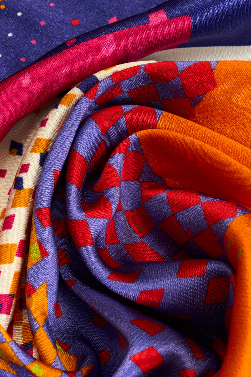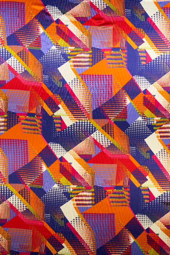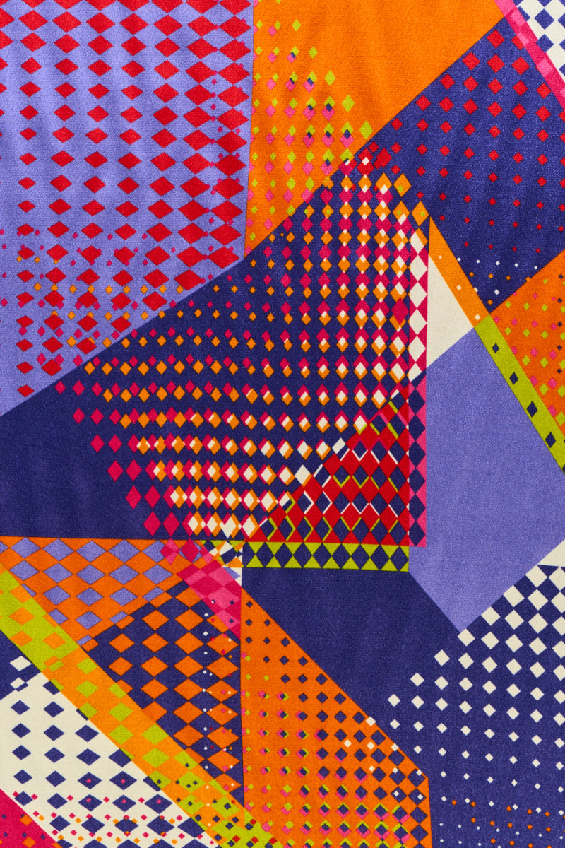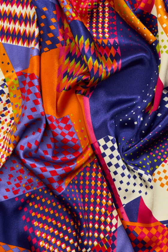 Italská viskózová tkanina s barevnými geometrickými motivy. Zajímavý vzor skládající se z geometrických prvků různých velikostí v intenzivních barvách. Látka je splývavá, masitá, neelastická, hladká, se saténovou vazbou - má krásný lesk. Veselá nabídka, ze které si můžete vykouzlit šaty, halenku nebo kombinézu.