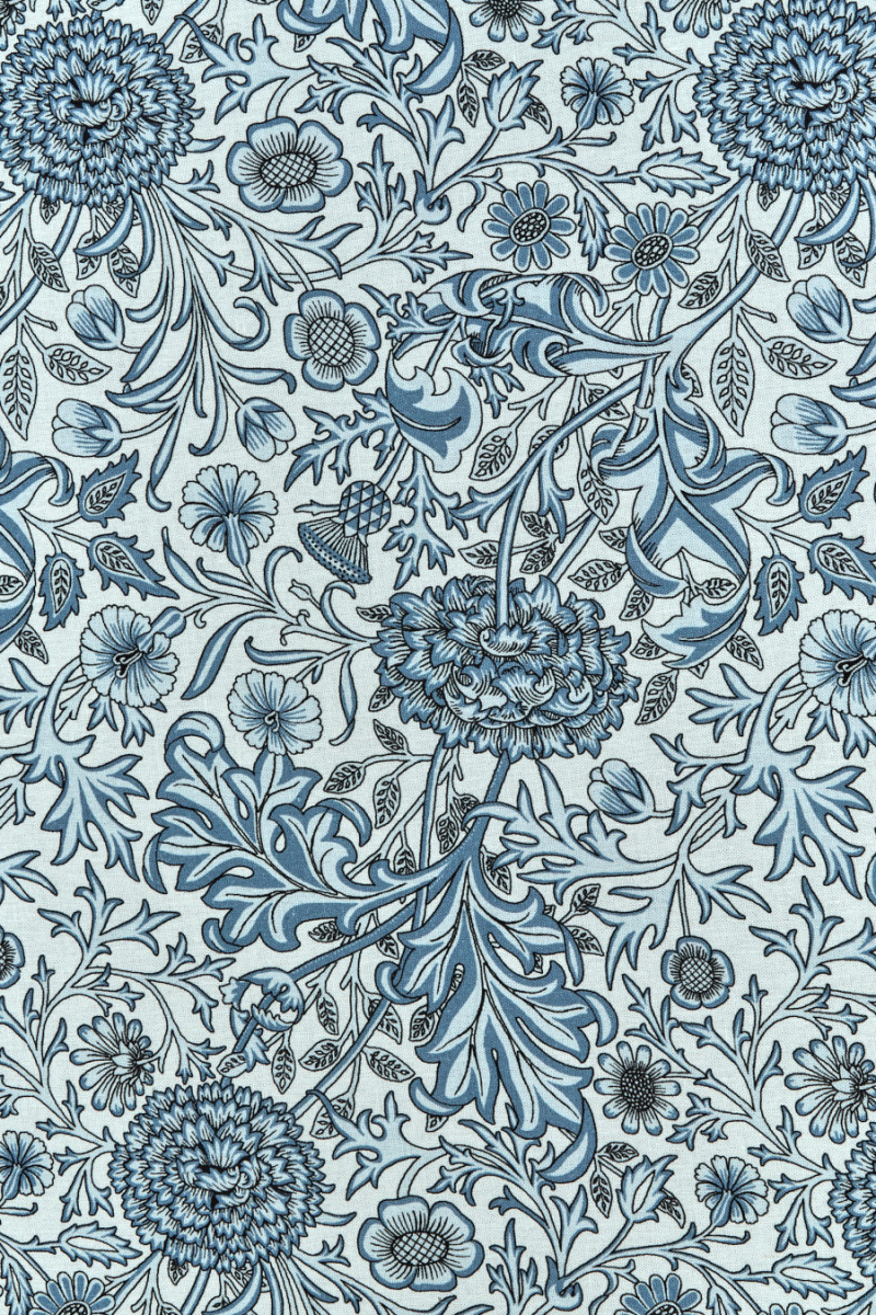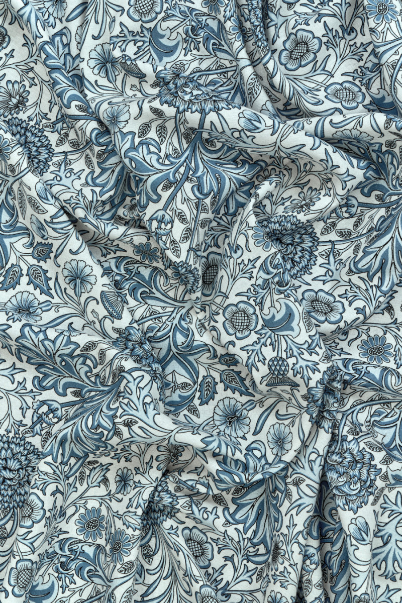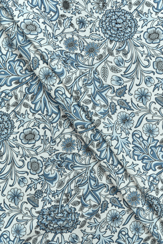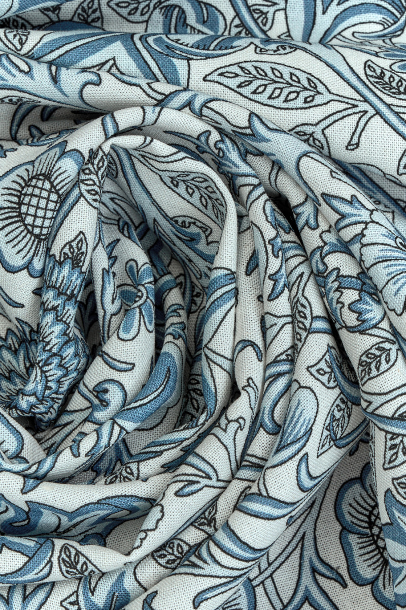 Italská látka vyrobená ze směsi viskózy a lnu s hustým květinovým motivem v modrošedé barvě na krémovém podkladu. Látka je lehká, měkká, neelastická, neprůhledná a ve vazbě vypadá jako len. Romantická nabídka ideální pro letní outfity, ideální pro košile, sukně, šaty.