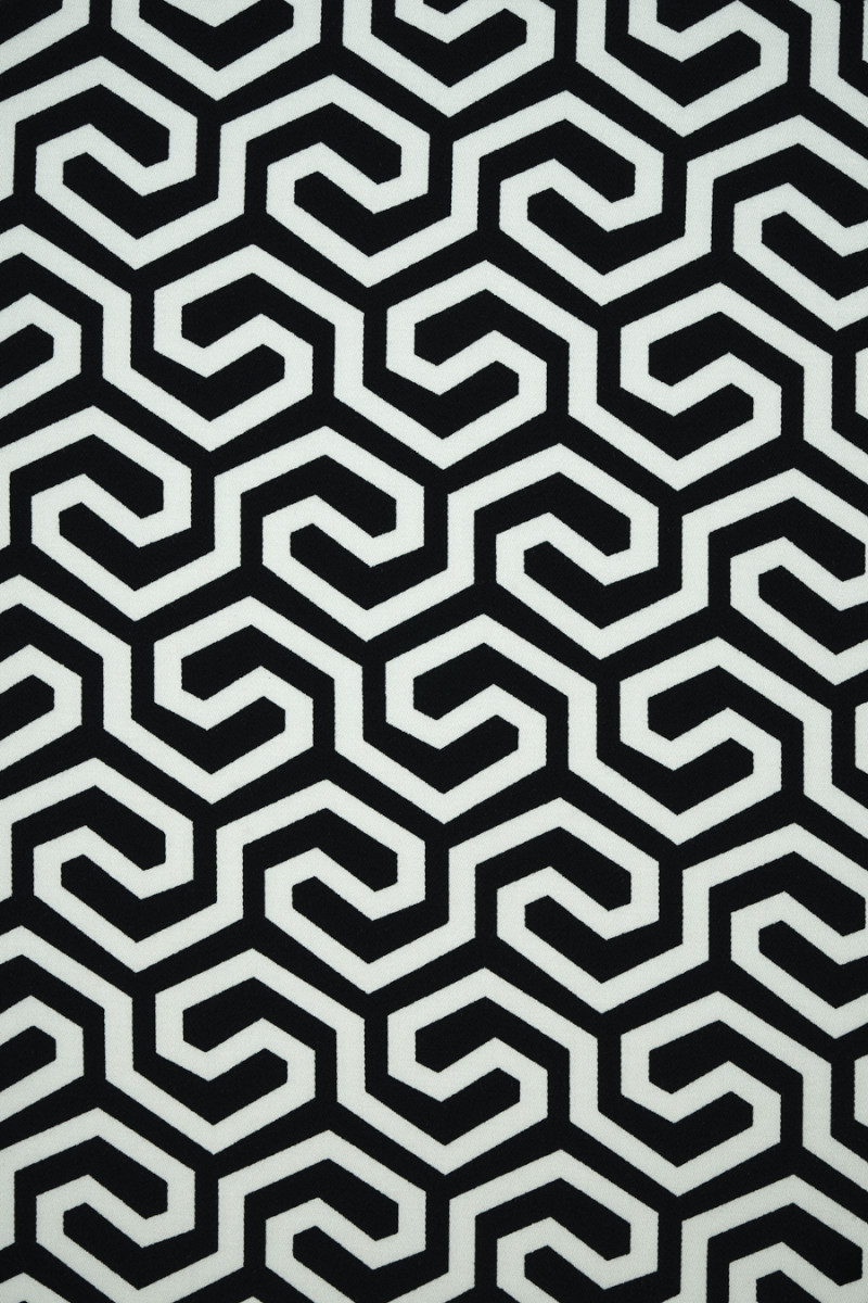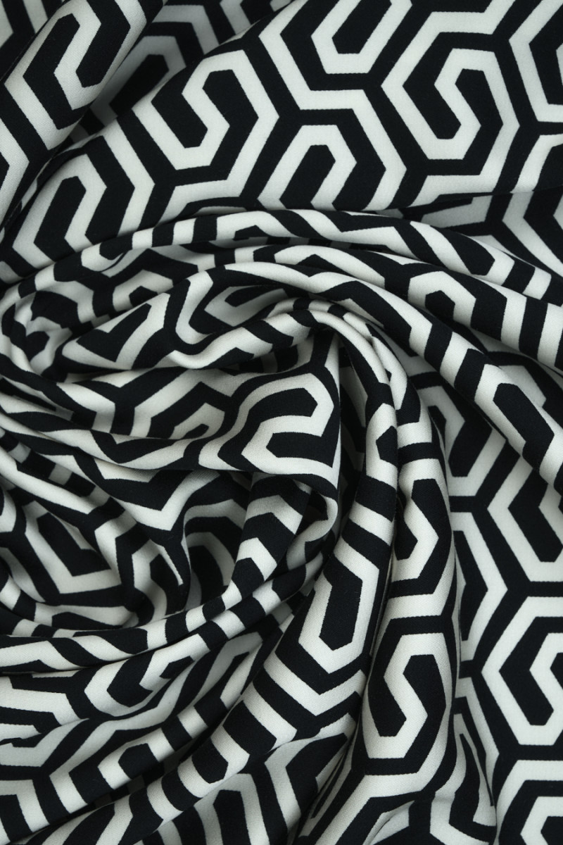 Italská látka 100% viskóza s geometrickým motivem v barvách ecru a černá. Hustý, pravidelný vzor připomínající včelí plástve. Látka je splývavá, příjemná na úchop, tenká, ale neprůhledná a neelastická. Nadčasová nabídka, která se bude dobře hodit na vzdušné šaty, sukně, ale i halenky a košile.
