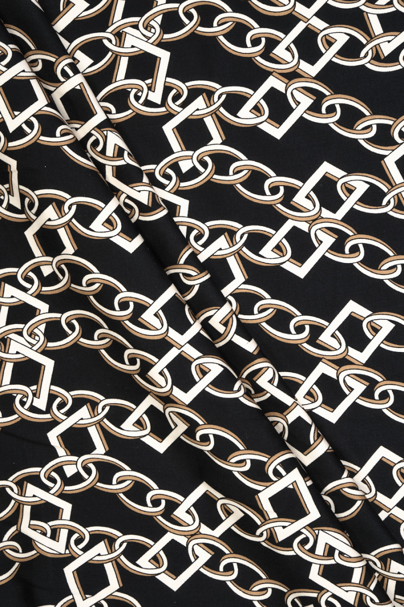 Italská tkanina 100% viskóza s motivem řetízku na černém pozadí. Hustý a pravidelný vzor vyrobený v krémové a béžové barvě, jeden řetízek je široký asi 2,5 cm. Látka je splývavá, měkká, příjemná na dotek, tenká, ale neprůhledná a neelastická. Zajímavá nabídka pro lidi, kteří mají rádi látky s charakterem. Skvěle se hodí pro šití vzdušných šatů, sukní, ale i halenek a košil.