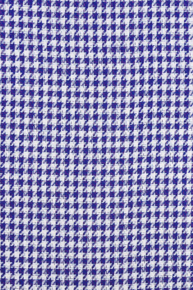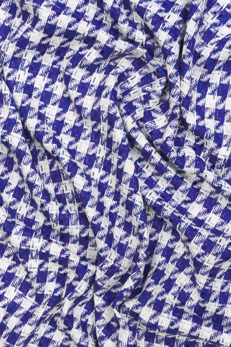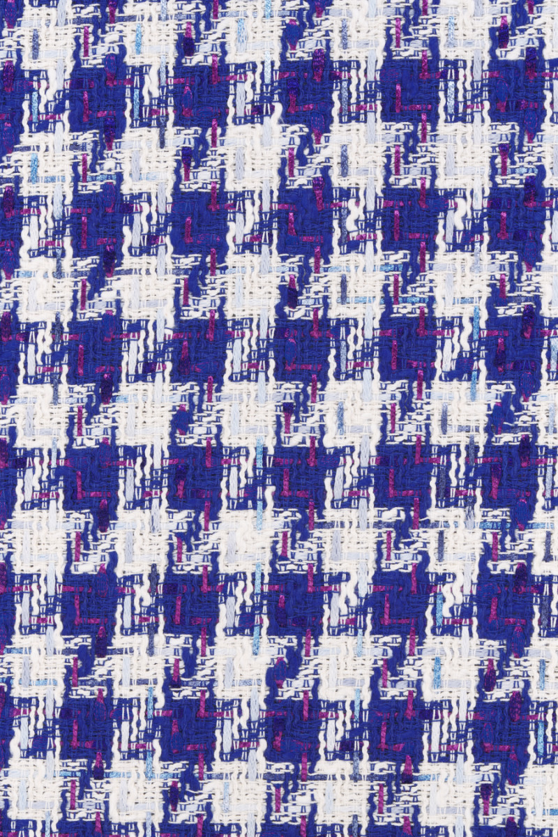 Italská kostýmní látka chanel ve světle tmavě modré a krémové barvě, zdobená třpytivou nití ve fuchsiové/růžové.